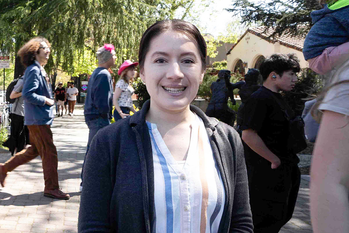 ![]() 图6:戴维斯大学的学生尼克(左)和卡米尔(右)为法轮功学员的队伍欢呼 |
