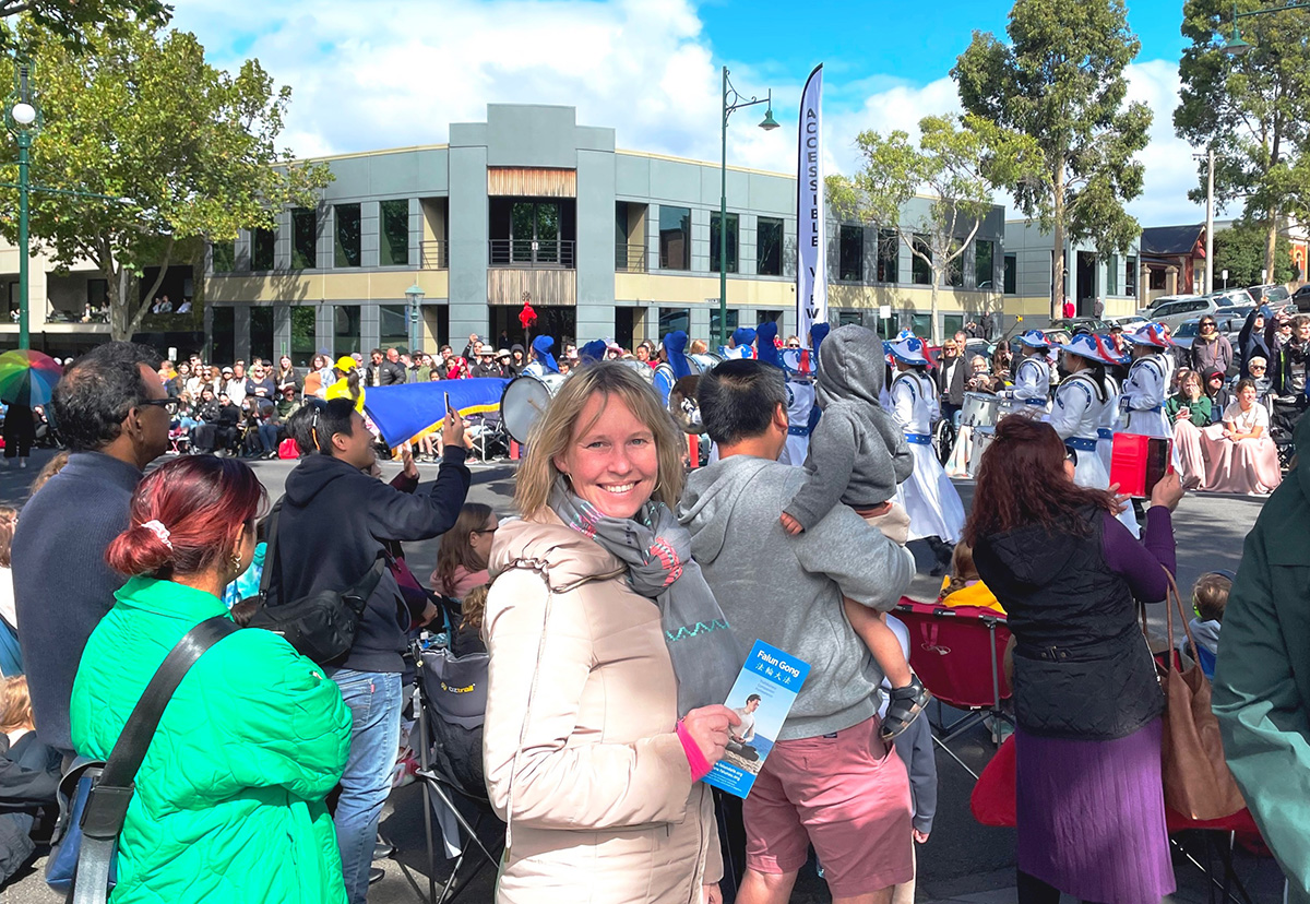 她说:我知道法轮功在中国仍然受到打压。我认为,他们以美妙的方式展现了平和以及正念正行(mindfulness)。“所以我真的很高兴看到他们也能参加游行,(身为澳洲人)也很开心能对生活在这里的修炼人提供支持。”