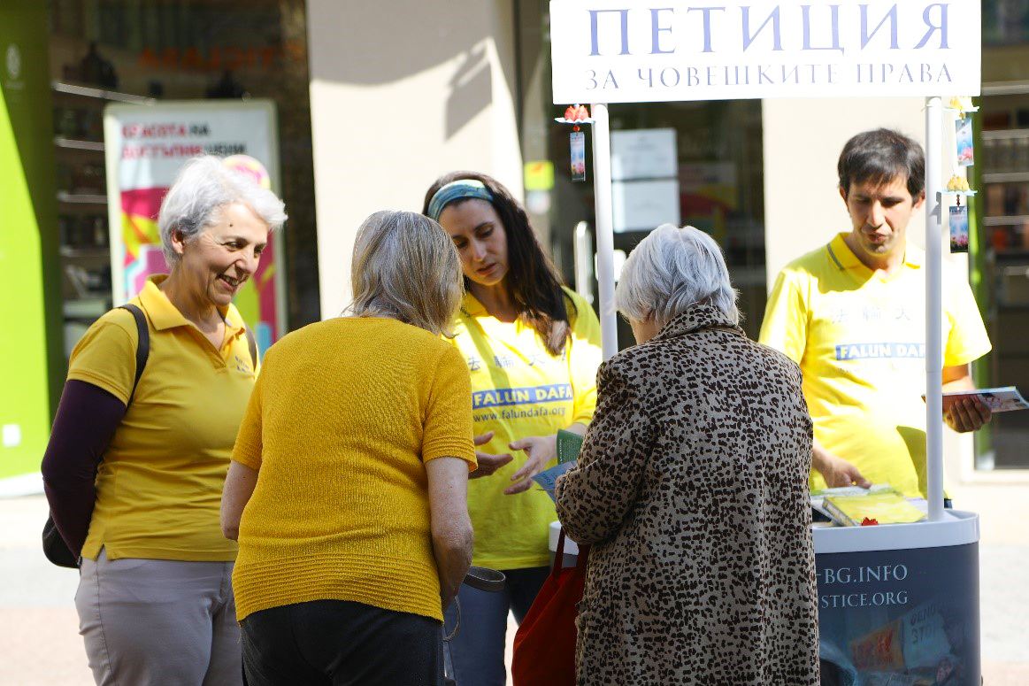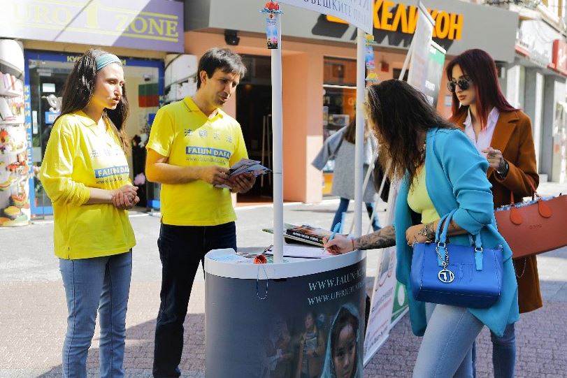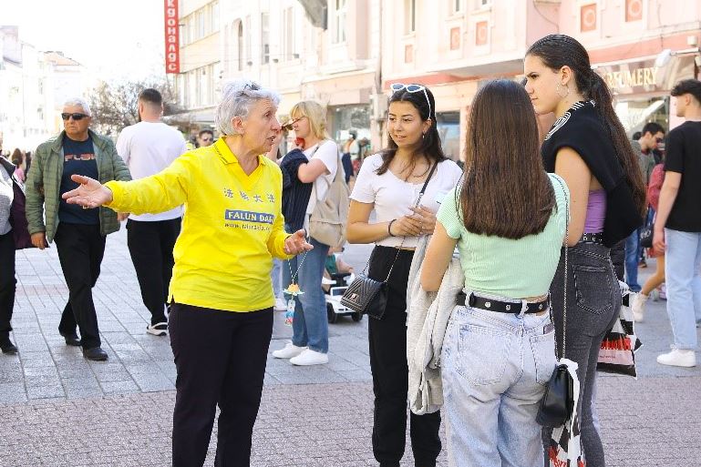 两名普罗夫迪夫音乐学院的学生停下来,接受了学员递给她们的真相小册子。她们看了真相资料,想了解为什么会发生迫害。学员告诉她们,一九九九年,法轮功修炼者人数近亿,超过中共党员人数,时任中共党魁的江泽民出于嫉妒和恐惧心理,发动了对法轮功的迫害。