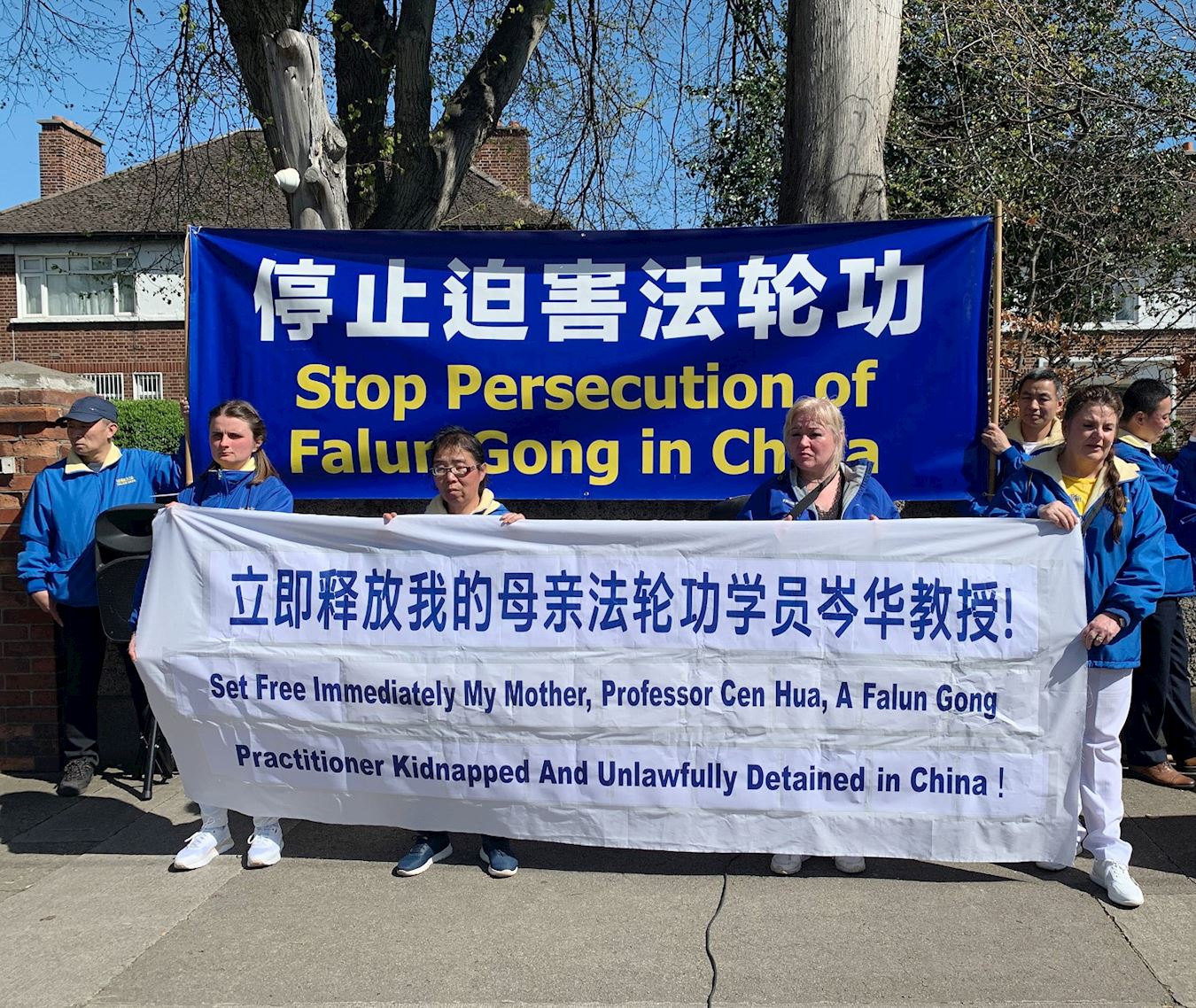 ![]() 图1~2:二零二三年四月十七日,爱尔兰法轮功学员在中领馆前举行新闻发布会,呼吁营救北京法轮功学员岑华,爱尔兰议员到场声援。 |