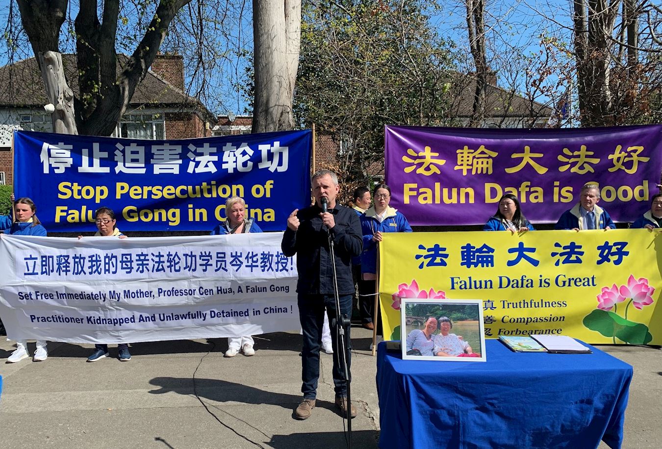 “我在此恳请爱尔兰政府、媒体、以及善良的民众能够施以援手,呼吁(中共)立即释放我的母亲岑华女士!”