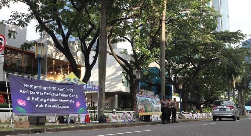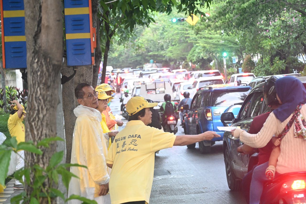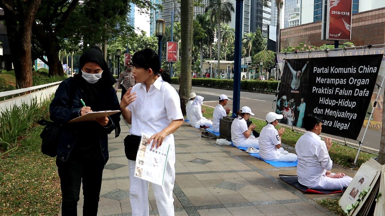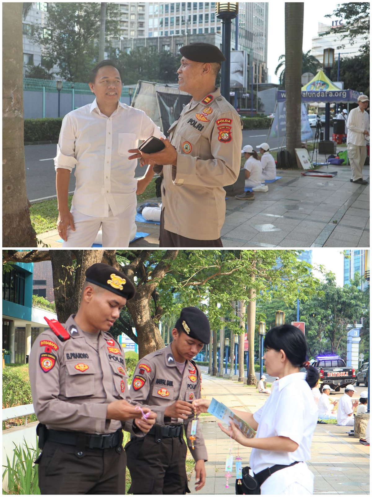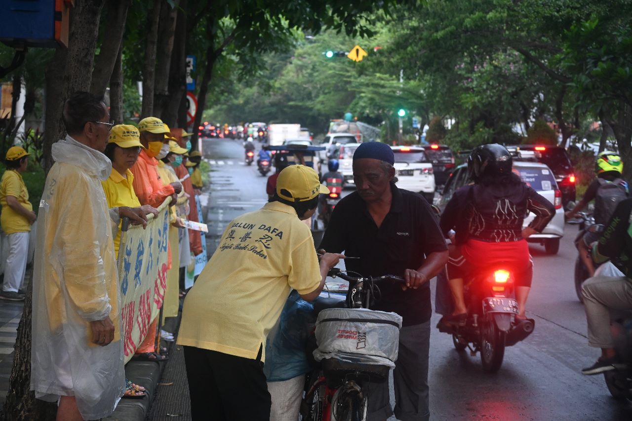 雅加达和泗水的活动期间,学员集体炼功,展示法轮功的和平功法。学员们还打出了展示反对迫害的各种横幅,并收集反迫害签名,以及向经过该地的路人还有警察们讲清真相。