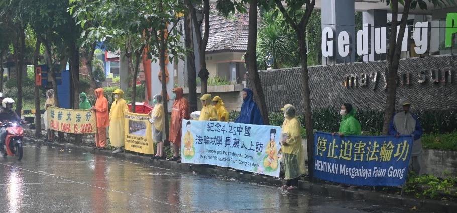 四月十五下午,虽然下着大雨,泗水市的和平活动仍庄严地进行着。当日的交通非常繁忙,因此许多驾驶者有足够的时间能够阅读横幅上所写的讯息。