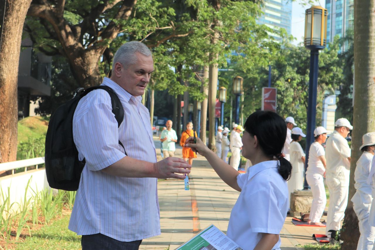 活动進行期间,雅加达首都许多市民签名支持呼吁停止迫害。居住在雅加达的一名外籍人士说,他曾经听说过这场迫害,但是他并不了解法轮大法是什么。听过学员的解释之后,他收下了学员给的写着“法轮大法好”的纸莲花。