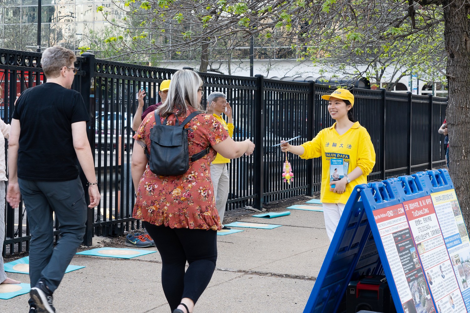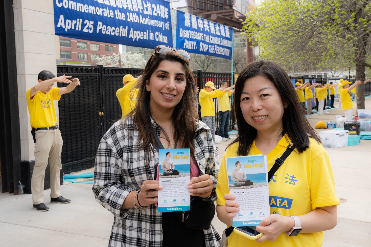 芝加哥人娜莎特然(Nastaran)来自于伊朗,她表示,她一路横穿过炼功中的法轮功学员。看到学员们在这么平和的音乐中展现平静祥和,这正和如此残酷的迫害真相,形成了非常强烈的对比。她很为在中国遭受到迫害的法轮功学员感到伤心(heartbreaking),她非常支持法轮功学员坚持真理的行为。