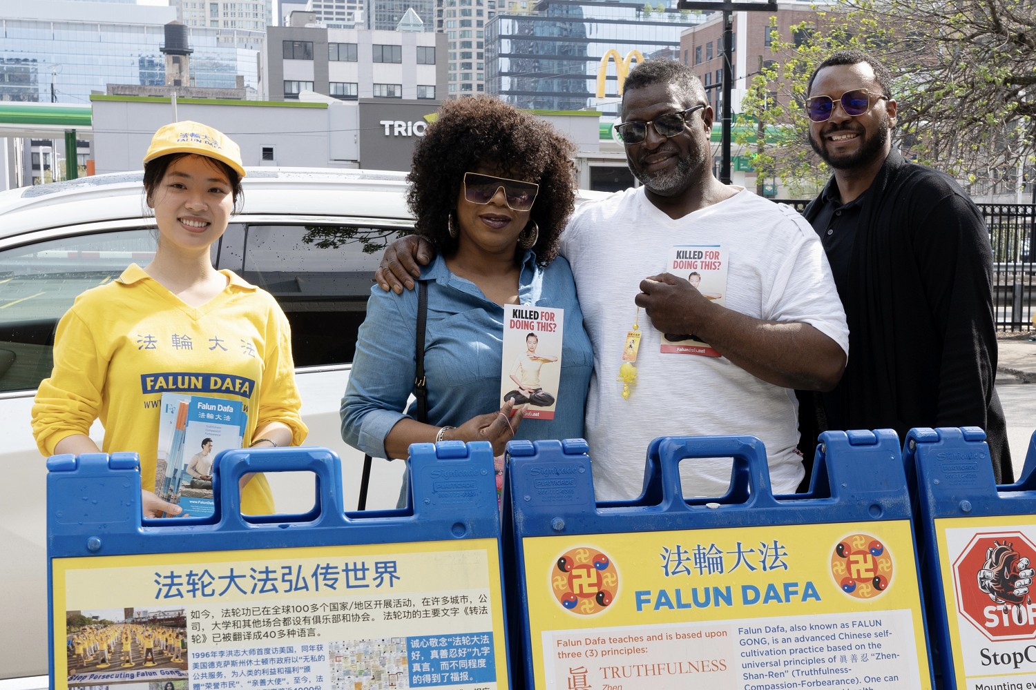 俄亥俄的赛蒙·琼斯(Simone Jones)和李·琼斯(Lee Jones)夫妇来芝加哥参加侄儿杰若米(Jeremy)的学术演讲。琼斯夫妇主动询问法轮功学员他们可以做什么来帮助法轮功,学员们表示,他们只是希望更多的人了解真相。