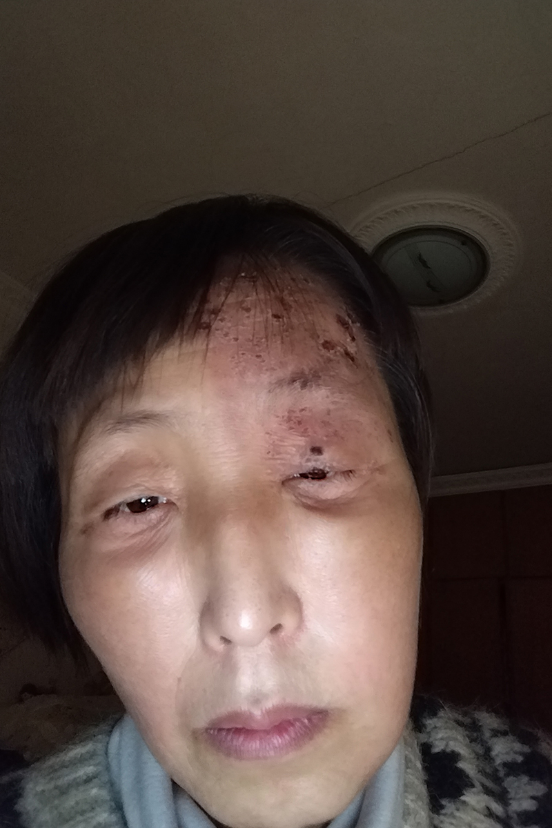 二零一零年左右,我看到婆婆家挂着毛魔头像,多次跟婆婆说家里不能挂死人像,应该清理掉。婆婆说:好、好。一天,我丈夫他们哥仨去婆婆家打麻将,我也跟着去了,進屋就跟婆婆又提起了此事,见婆婆没动,便自己动手把它清理了。没曾想,婆婆出去告诉了我丈夫他们,他们就進屋叫我把东西拿出来,我丈夫走到我跟前,二话没说一拳捣向我的左眼,我一下倒在地上,顿时左眼鲜血直流,我在心里喊:师父救我。这时我丈夫又拿起一个暖瓶照我头上砸下来,当时暖瓶就碎了,头上、身上都是白白亮亮的暖瓶胆碎片,血和水顺着脸往下流,满身都是血水,这时的左眼还在不停的往外淌血,当时我婆婆和家人都吓坏了。我大伯哥说,赶快送医院吧。我说,不用上医院,没事。