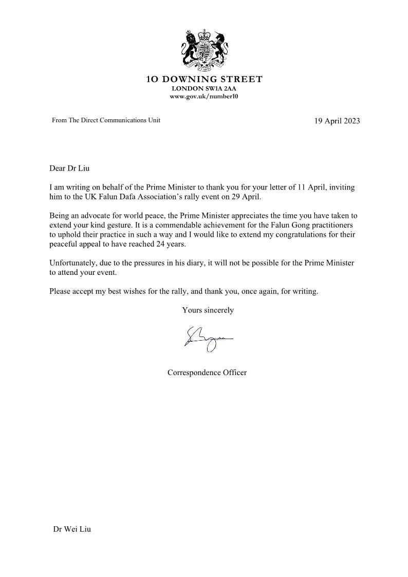 信中说:我代表首相写信感谢您四月十一日的来信,邀请他参加四月二十九日英国法轮大法学会的集会活动。