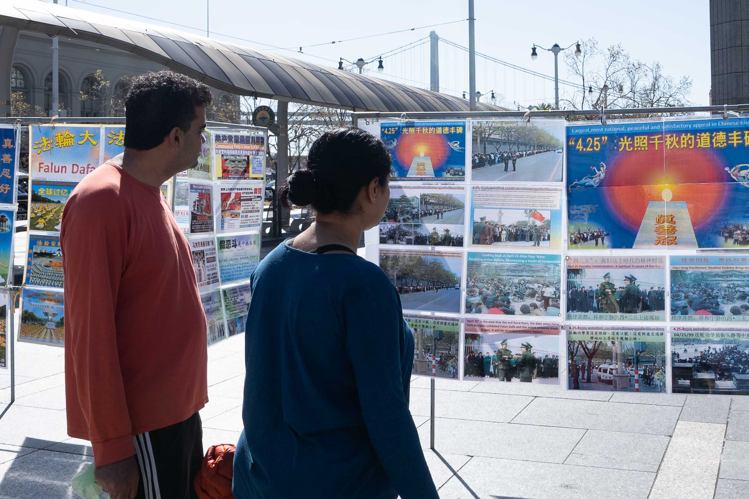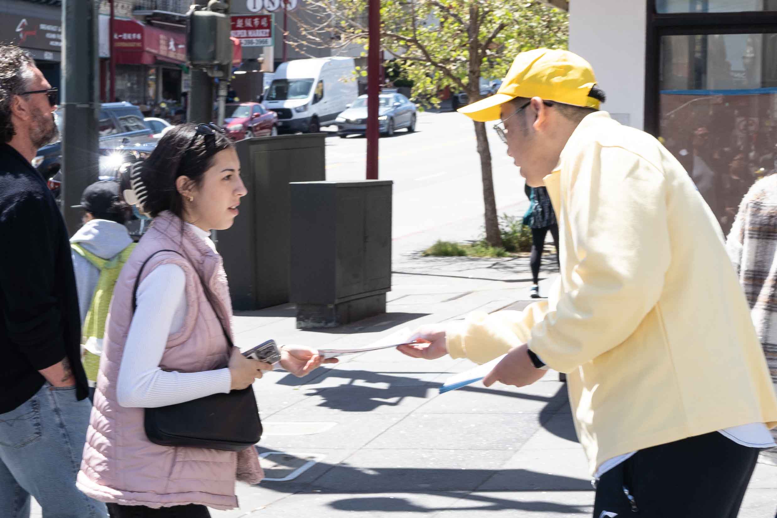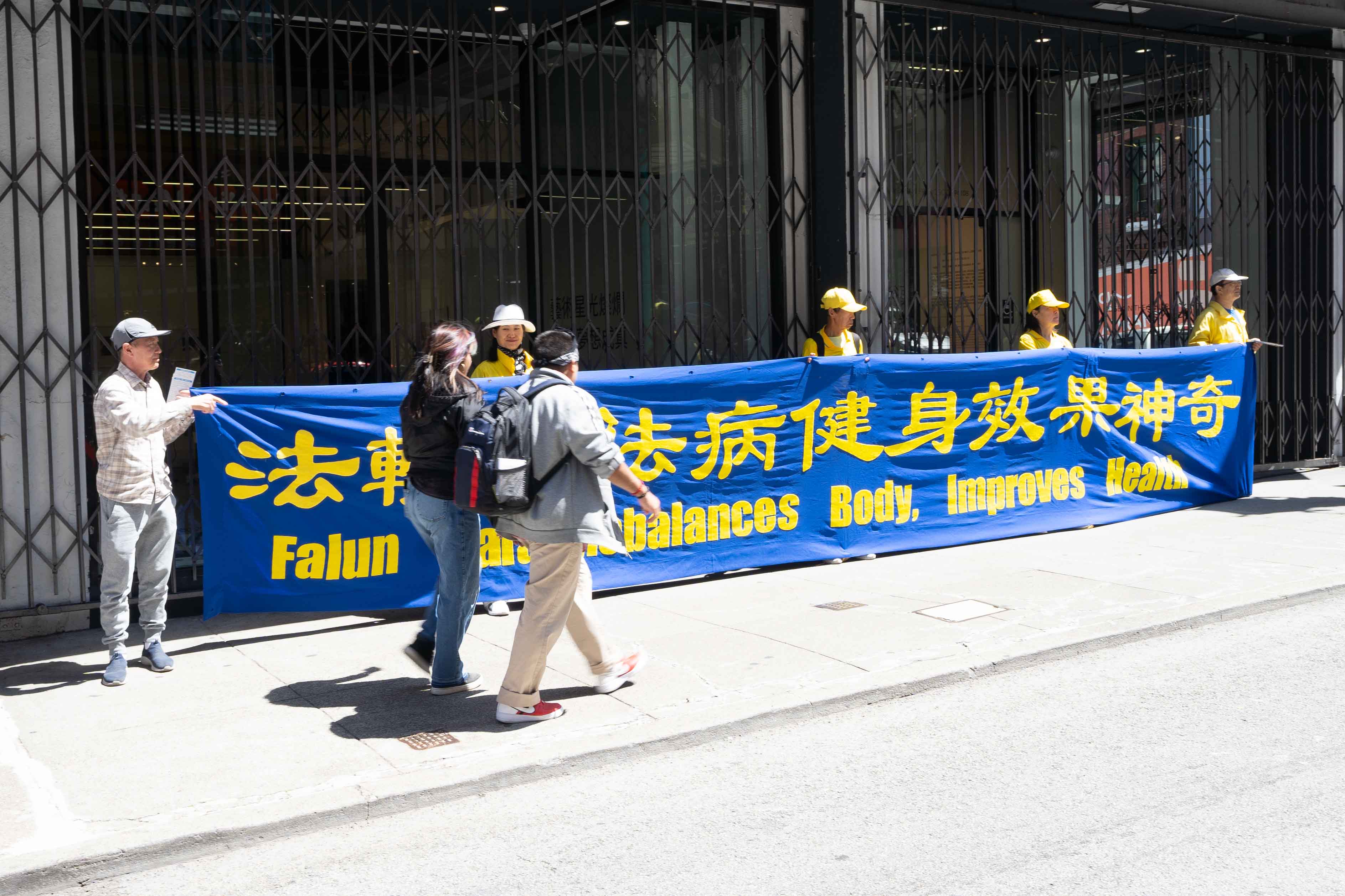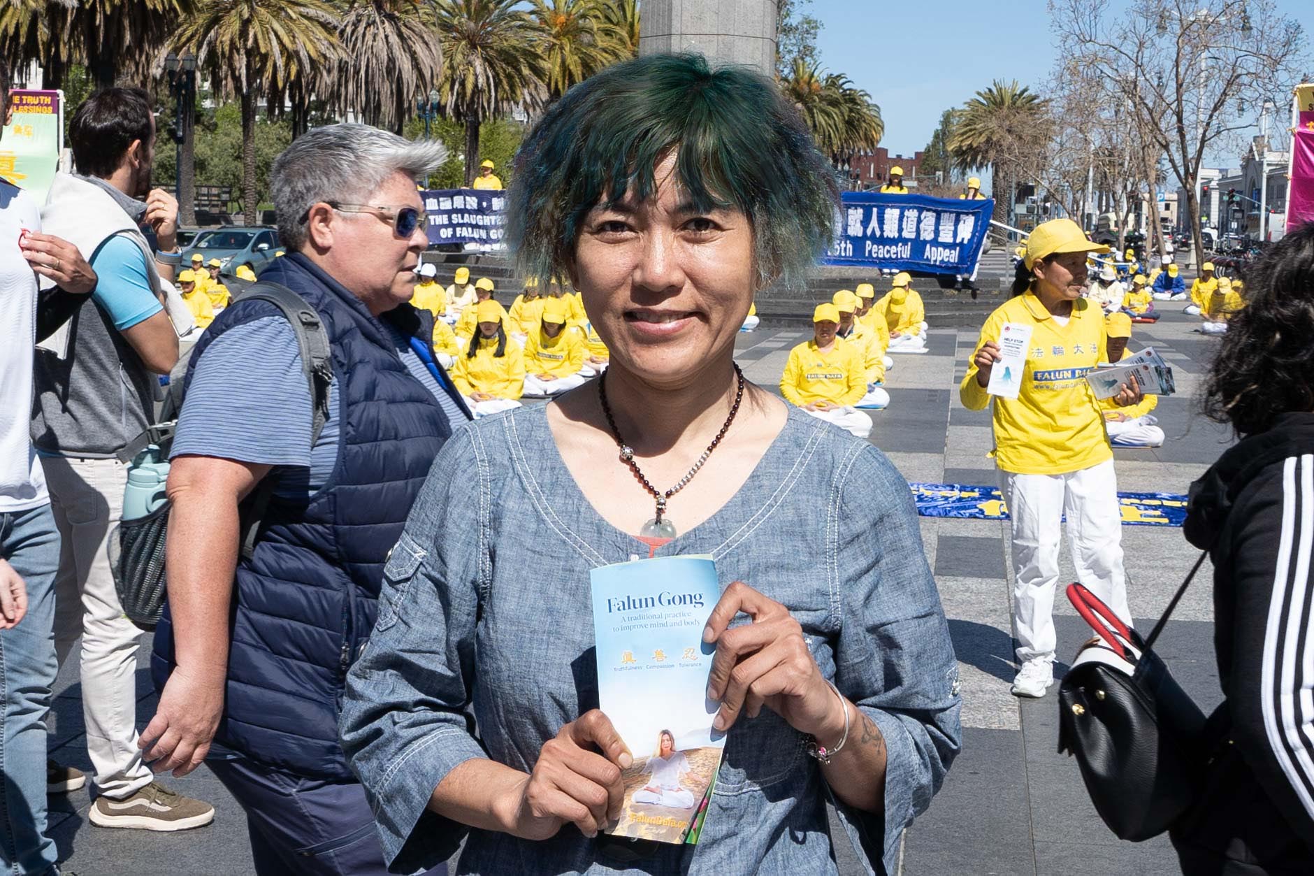 二零二三年四月二十二日,大陆新移民苏女士在美国旧金山渡轮大厦前广场看到法轮功学员纪念“四·二五”万人和平上访二十四周年的场景,流连忘返,她说,“我觉得法轮功挺好的,他们就是在一起炼功,对身心有好处,应该支持。”