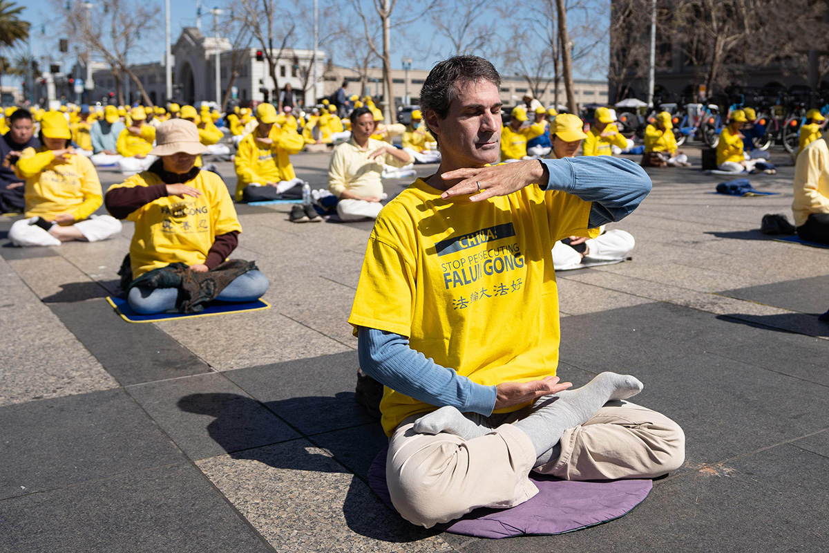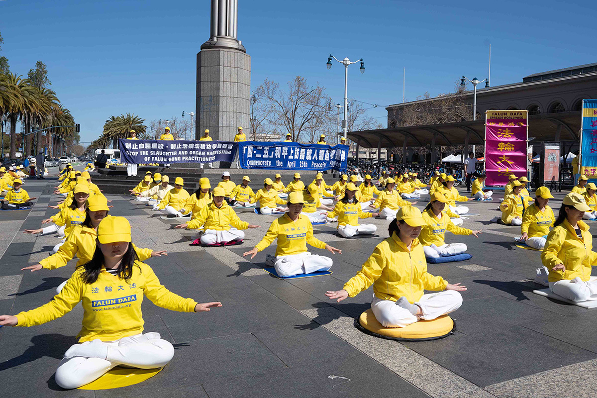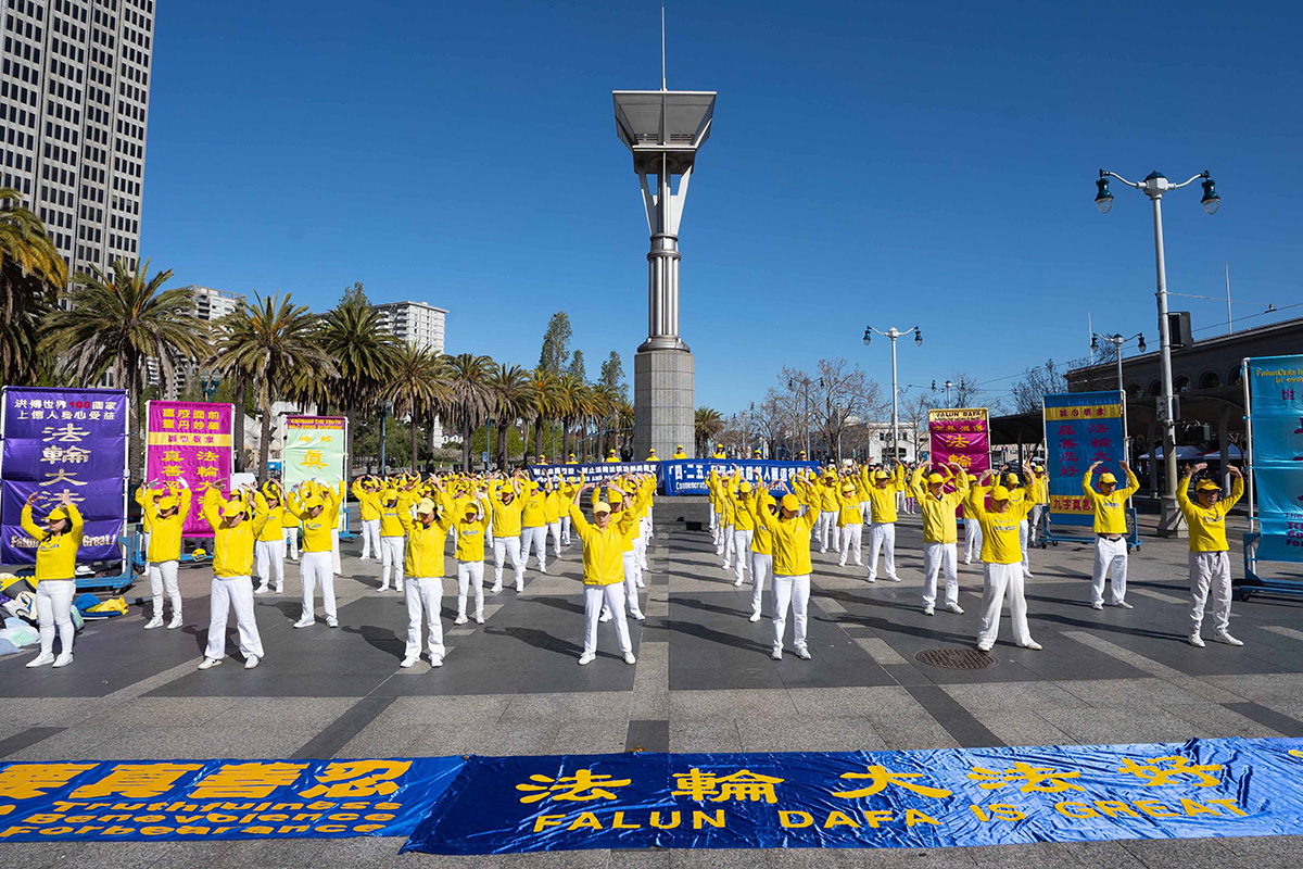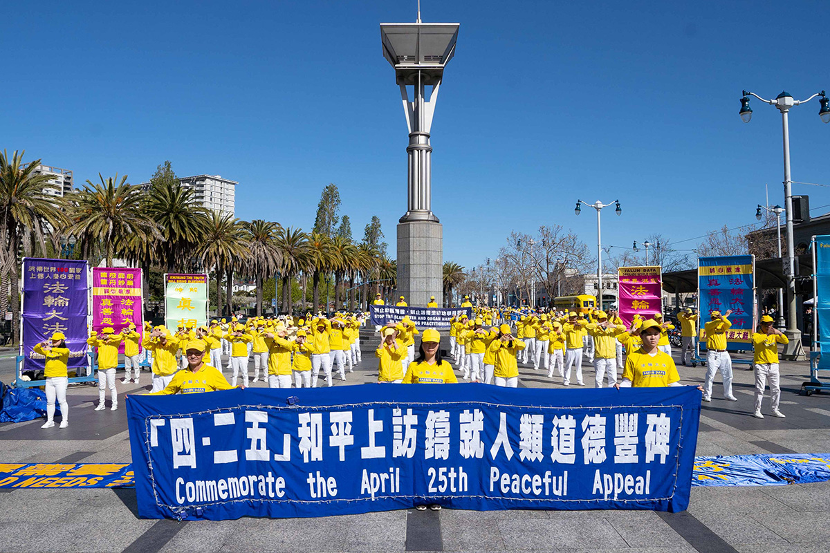 二零二三年四月二十二日,大陆新移民苏女士在美国旧金山渡轮大厦前广场看到法轮功学员纪念“四·二五”万人和平上访二十四周年的场景,流连忘返,她说,“我觉得法轮功挺好的,他们就是在一起炼功,对身心有好处,应该支持。”