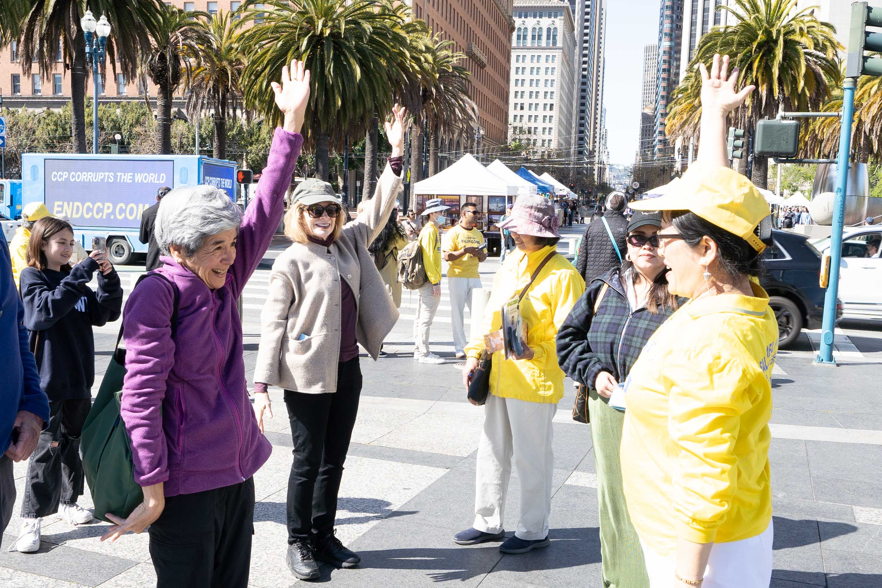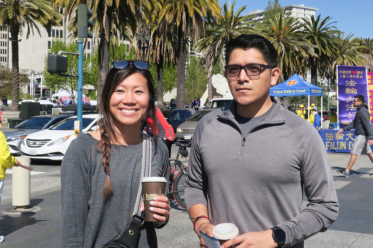 德州圣安东尼奥的居民阿里安娜·洛佩兹(Arianna Lopez)和好友路易莎·加西亚(Luisa Garcia) 来旧金山旅游,看到法轮功学员集体炼功和听到祥和的炼功音乐,她们被深深地吸引,驻足观看。她们表示,“吸引我们的是他们穿的鲜艳的黄色服装,每个人都整齐划一的在做同一个动作,非常的祥和、平静。同时,我们也能感受到一股强大的能量场,从每个人(学员)身上散发出的能量。我们因此心生一念:希望能学这个功法。”