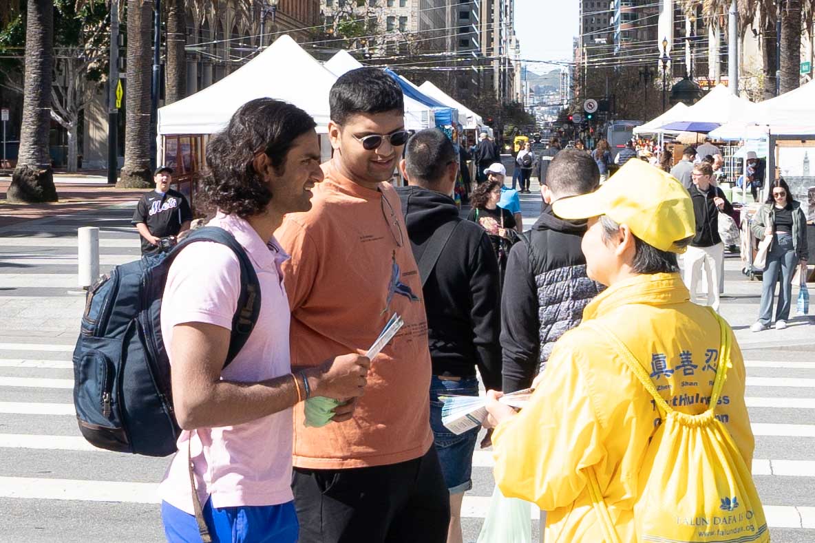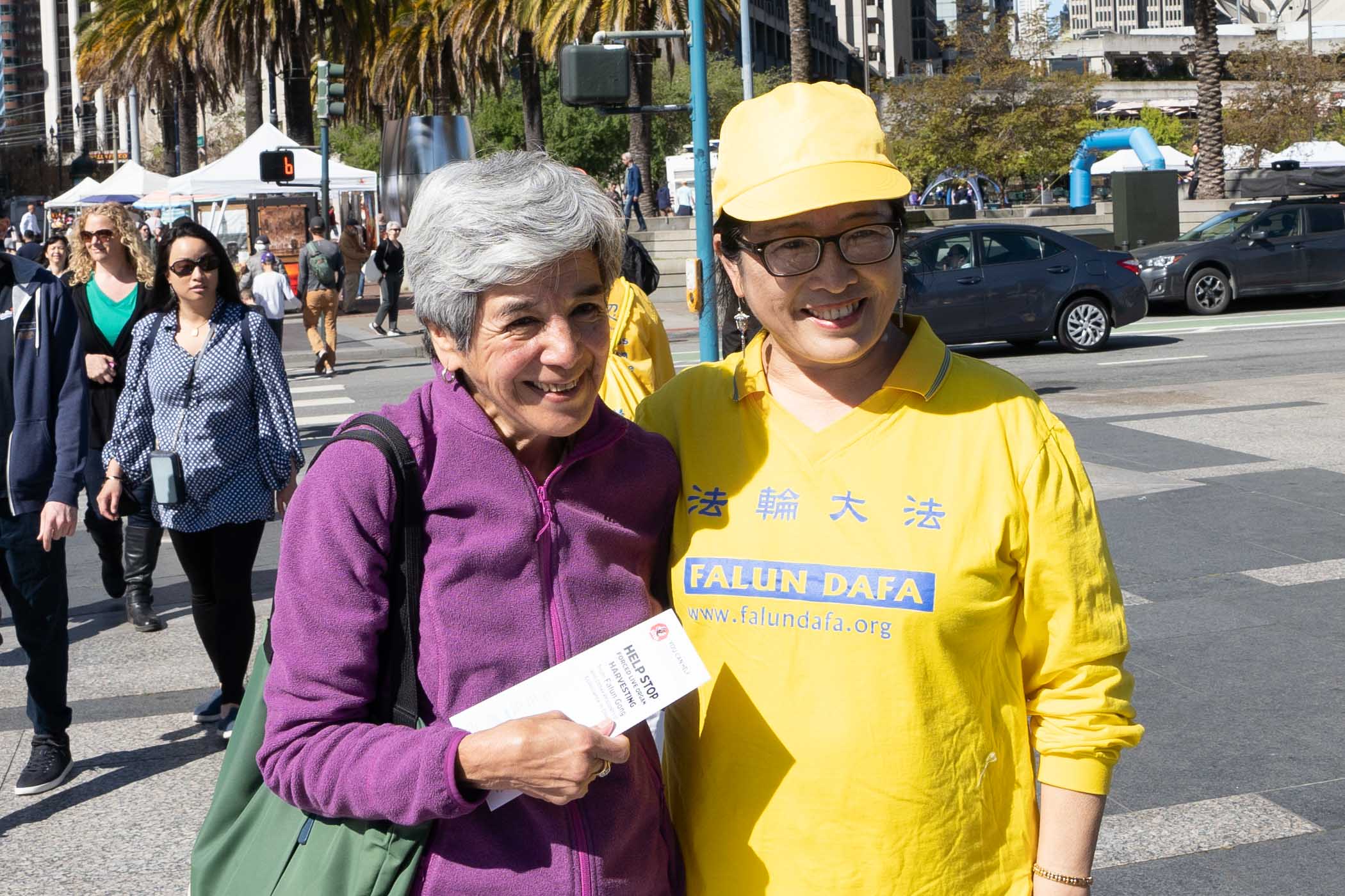 内布拉斯加州奥马哈的居民苏西·杜佩(Suzy Dupey)和朋友来旧金山出差和旅游,当经过法轮功学员举办纪念“四·二五”万人和平上访二十四周年活动现场,他们在要求解体中共(End CCP)的征签表上签名,以示支持。