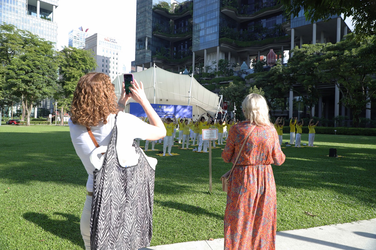 当天途经活动现场的民众有来自意大利、荷兰、澳洲等国的游客,也有来自周边马来西亚、印度尼西亚、印度、孟加拉国等地在新加坡的工作人士。很多人接过学员传递的真相资料,驻足与学员交谈;也有人在了解详情后,希望学炼功法;还有不少人举起手机拍照,记录下平静祥和的炼功场面。