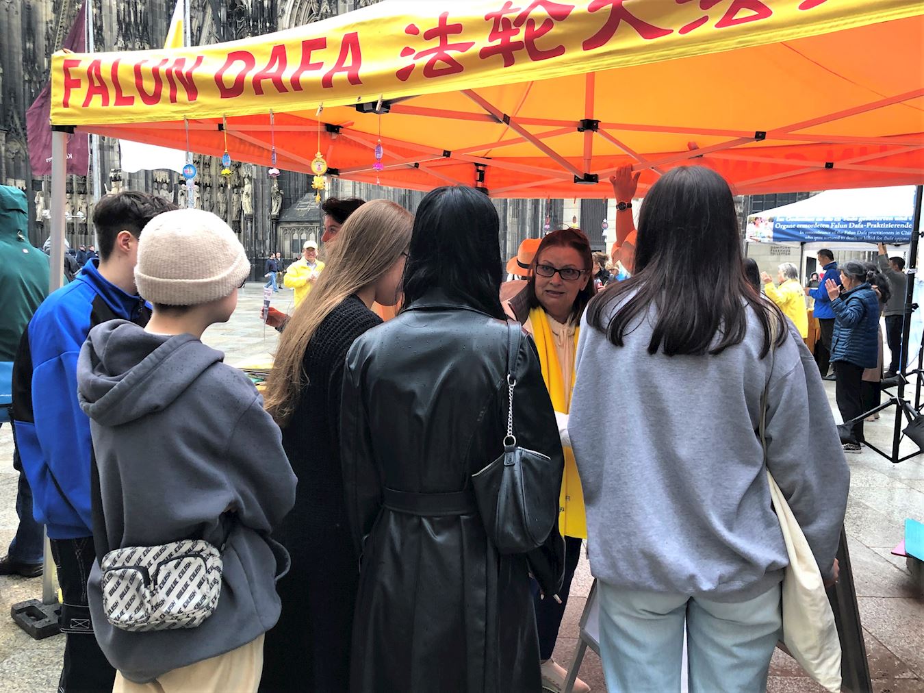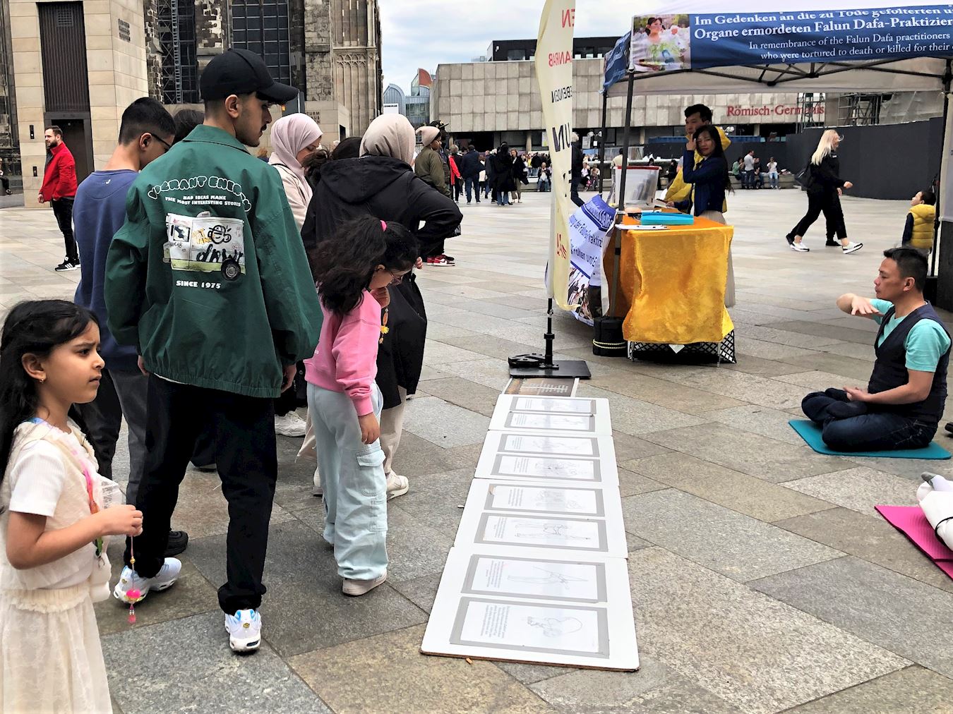 活动当天是周六,科隆大教堂处于市中心步行街,在欧洲重要火车中转站——科隆火车站旁边,教堂前的广场上过往路人和游客非常多。学员们在这里搭起展桌,展开大横幅,展示功法,征集签名。