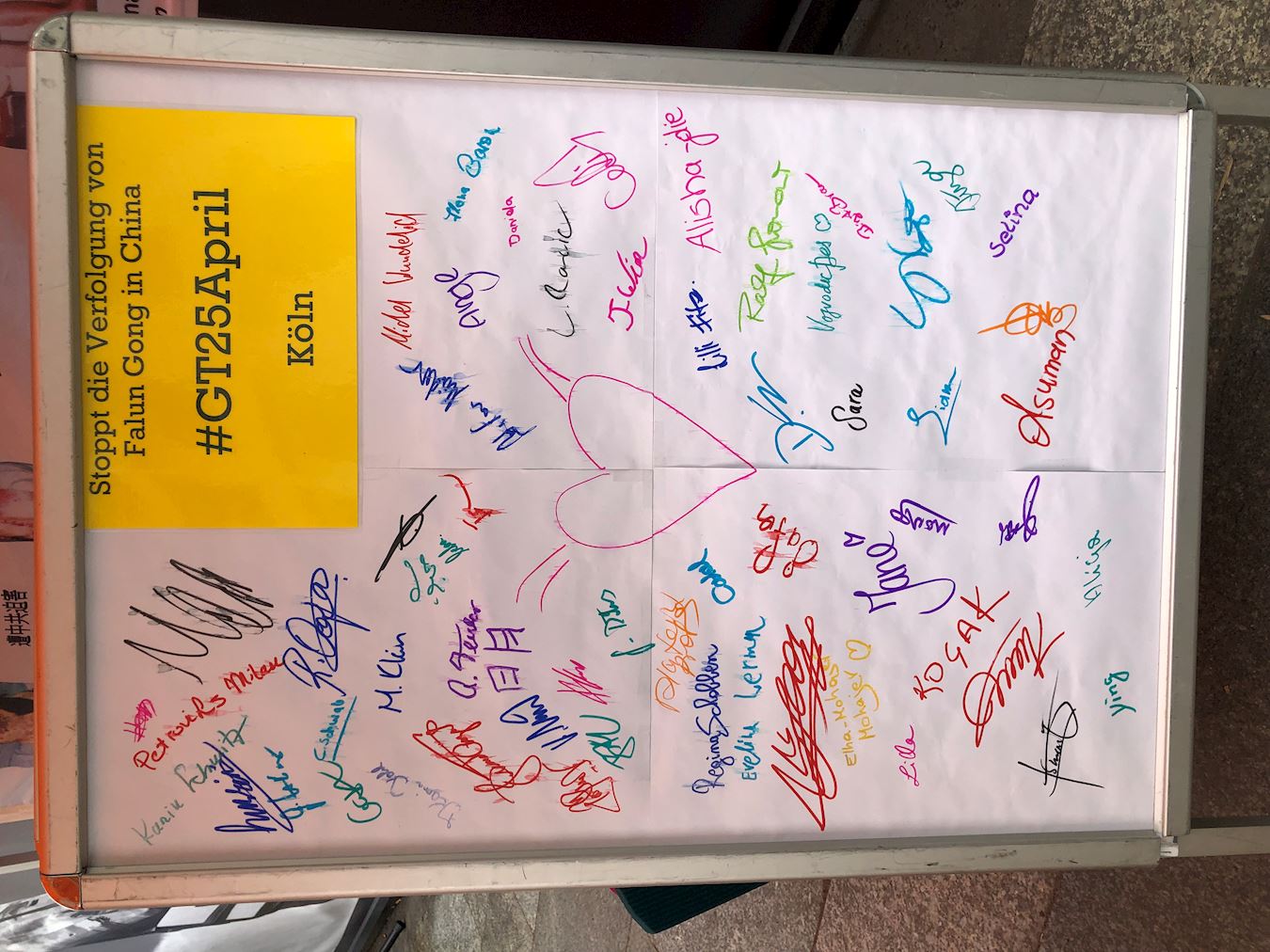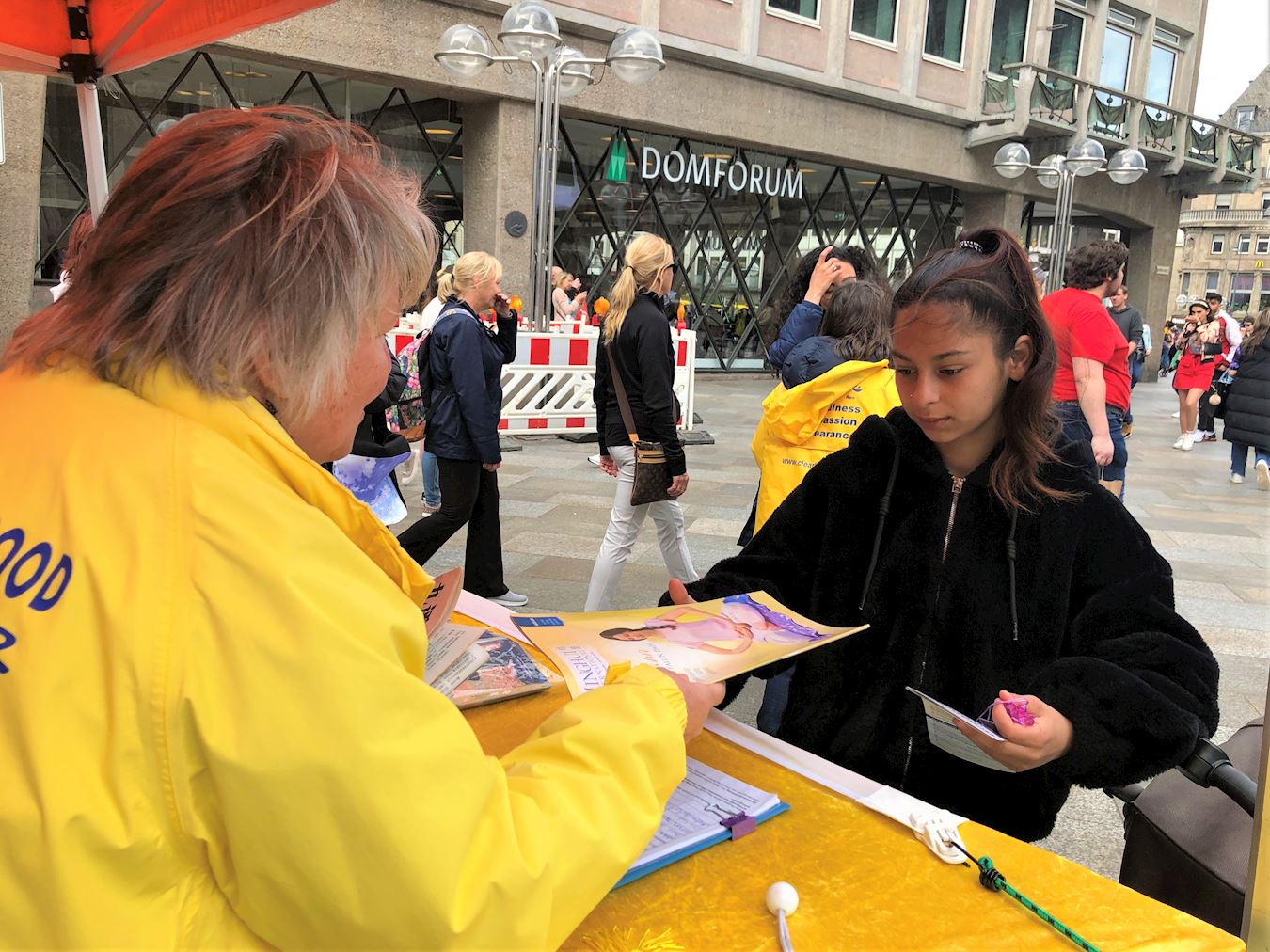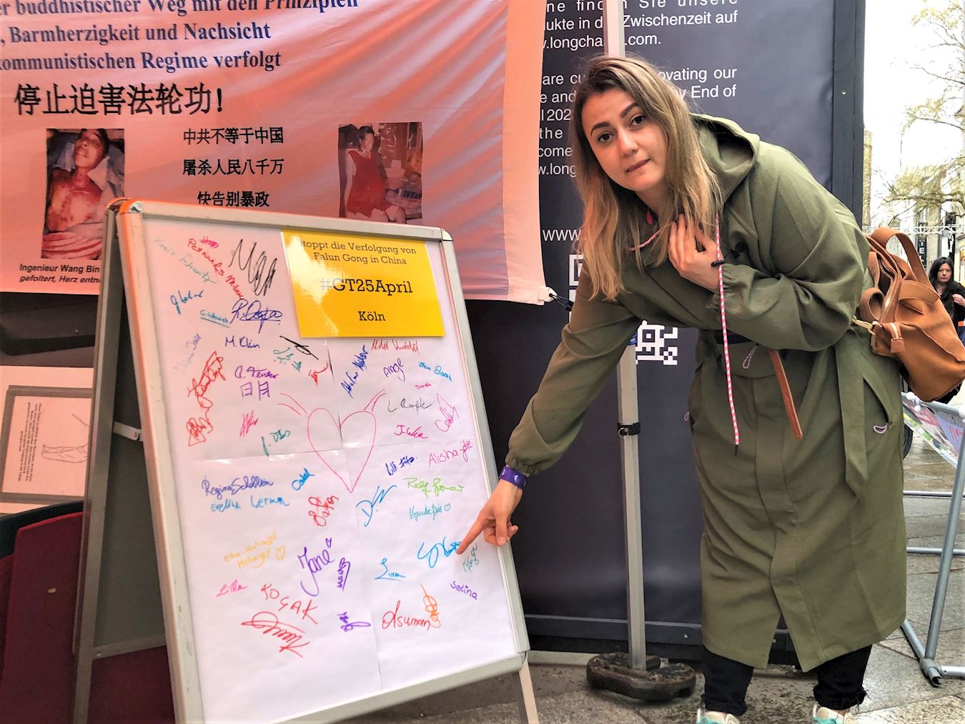 阿斯兰(Aslan)看到大教堂边的真相点就径直走过来签名,她说:“我经常看到法轮功(学员)的活动,比如在多特蒙德(Dortmund)、波鸿(Bochum)和法兰克福(Frankfurt),我都看到在街边有打坐的人(法轮功学员),所以对法轮功和(中共的)迫害有一定的了解。”