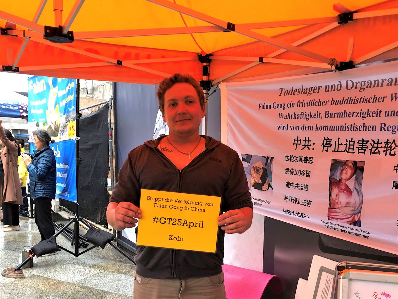 三位从杜伊斯堡(Duisburg)来科隆游玩的年轻女士了解到中共对法轮功的迫害后,举起了反迫害的展牌拍照。其中一位女士说:“知道发生了这么残忍的事情,我们当然会(为反迫害)做点什么。”