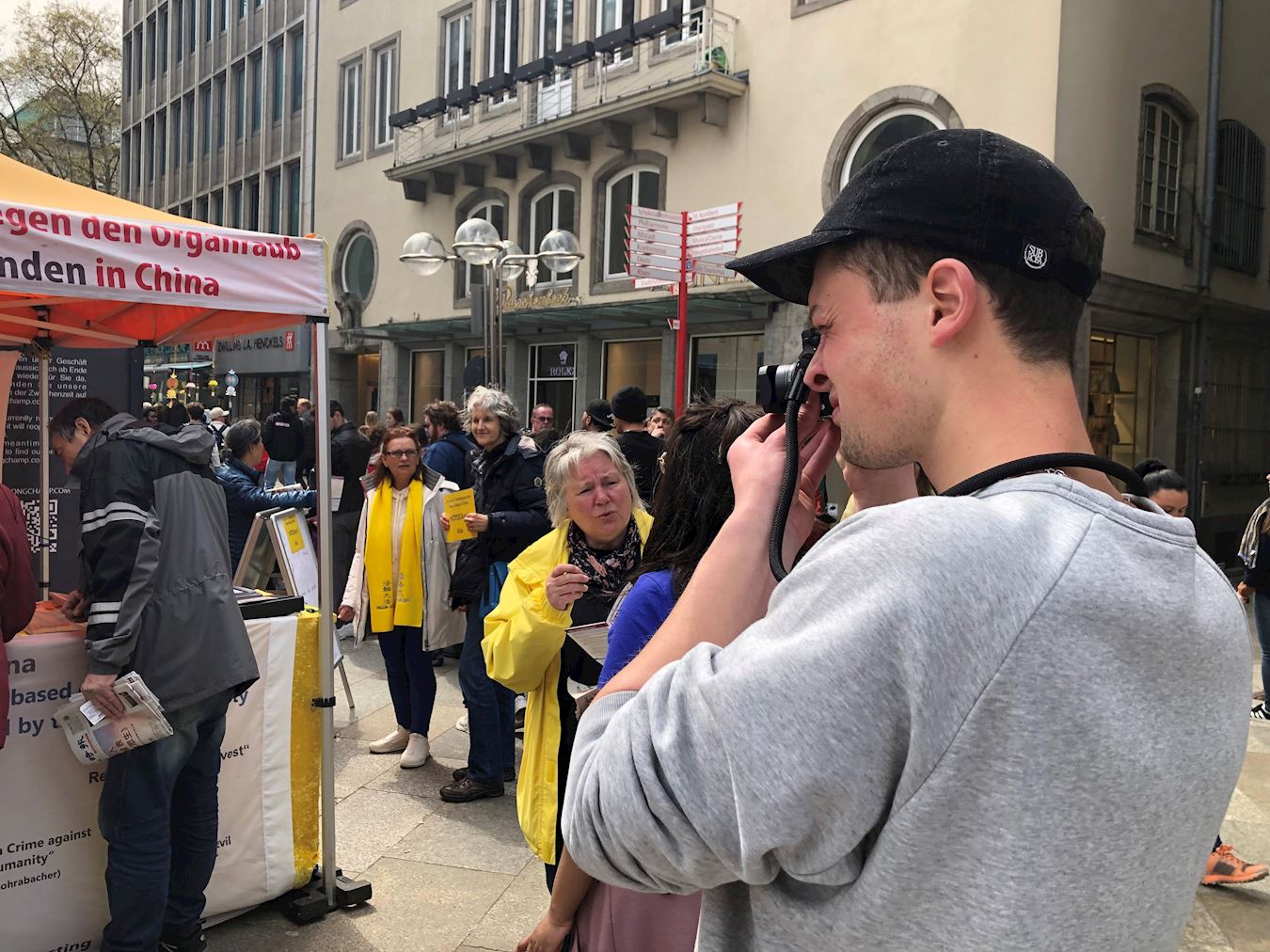 ![]() 图9:蒂莫(Timo)举起写有“停止迫害法轮功”字样的展牌拍照 |