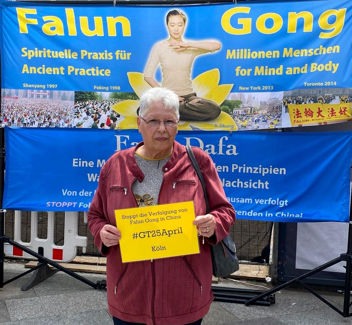 她还表示很佩服中国大陆的法轮功学员二十四年来坚持的和平反迫害、讲真相活动:“我知道反抗专制统治需要多么大的勇气。当年我们(在前东德)参加游行时,连亲人不敢告诉,怕他们受到牵连。”“