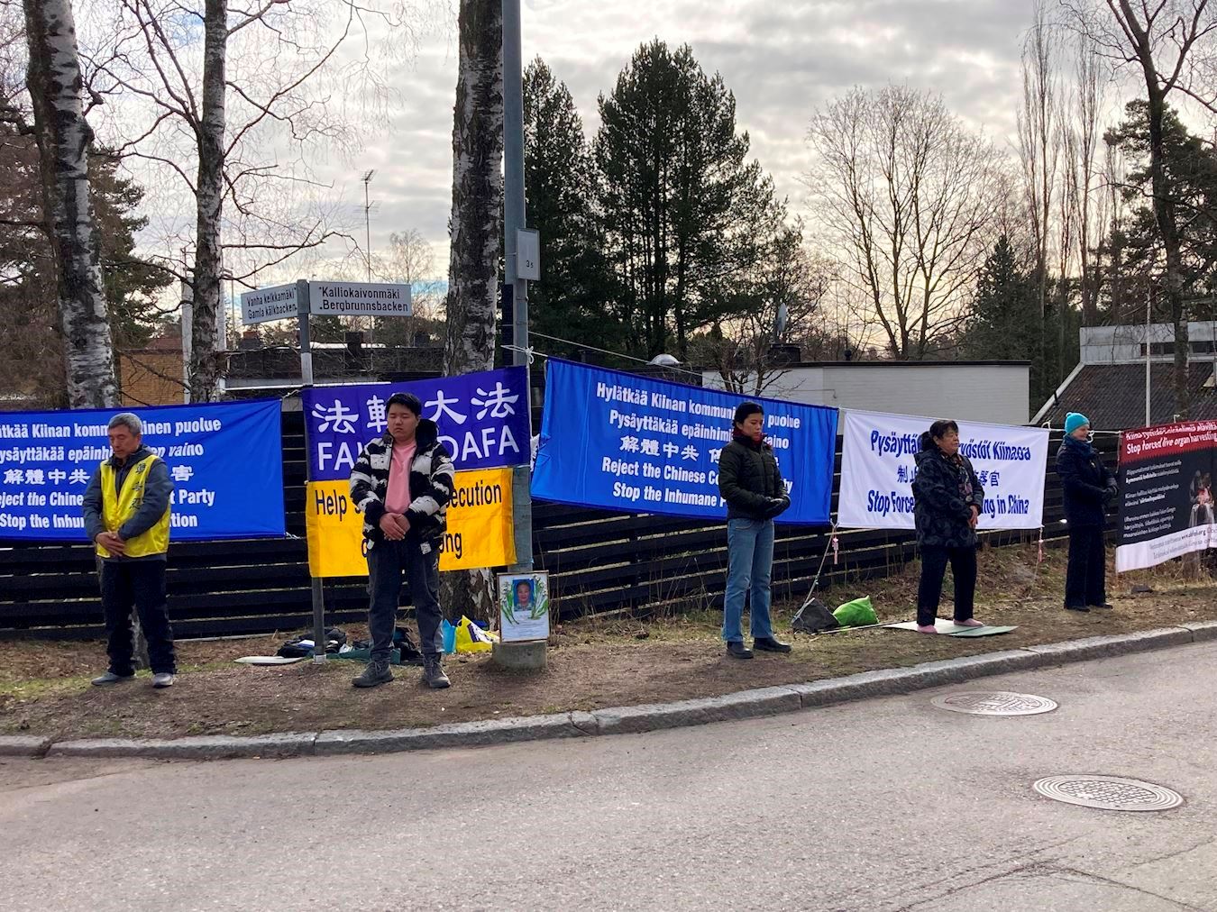 在中共大使馆前,学员展示出“解体中共反对迫害”,“制止中共活摘器官”等横幅,集体发正念,展示平和舒展的法轮功功法,以及向经过的路人和出入使馆的华人民众讲述真相。