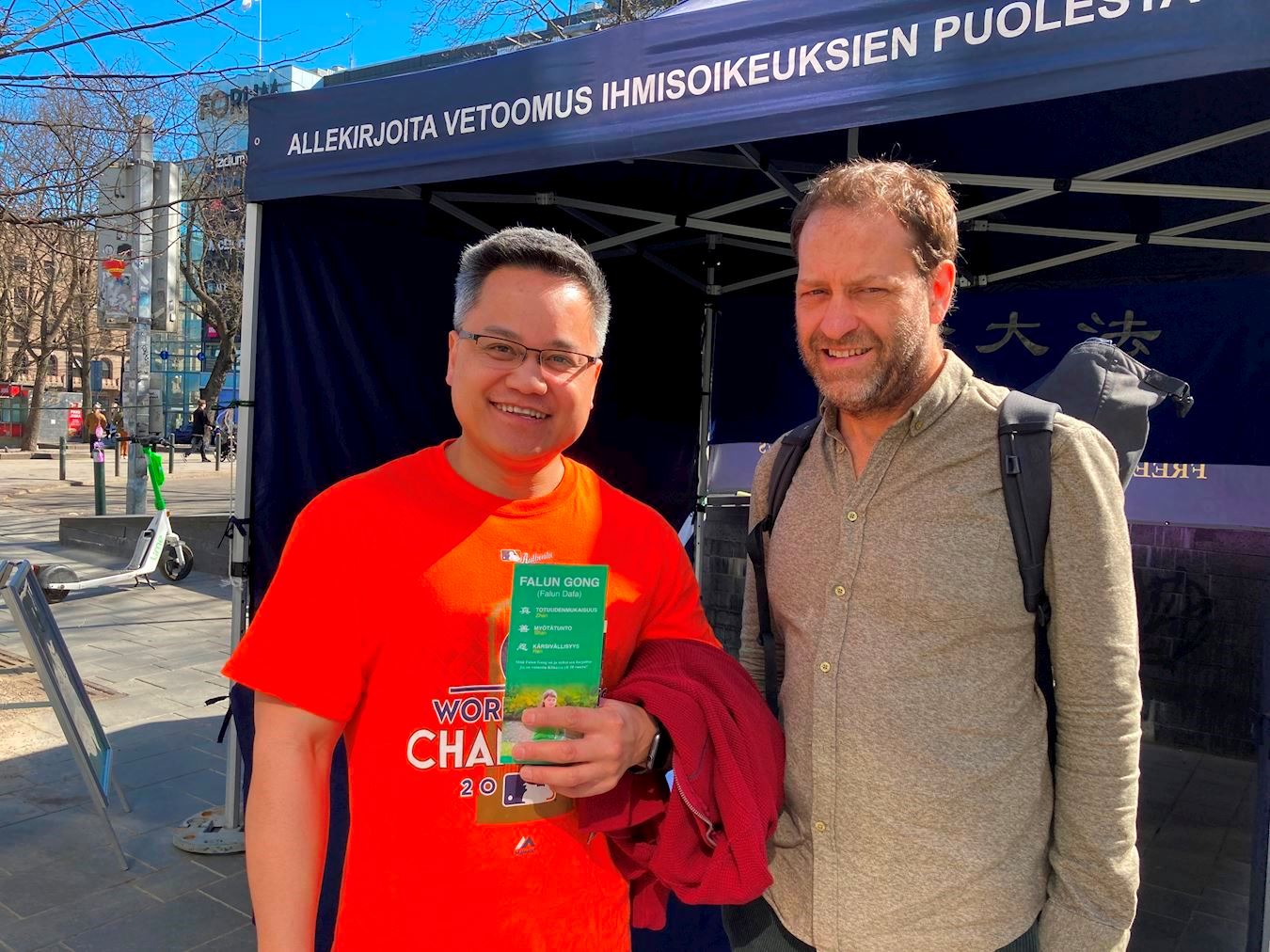 约瑟夫的朋友几周前就已经签署了请愿书,并表示憎恶邪恶的共产党。他们俩对中华文化有浓厚的兴趣,希望有一天能去中国看看。交谈时得知,他们知道致力于恢复中国传统文化的神韵艺术团,打算看一次,但票已经卖完了。他们还询问芬兰是否有神韵,并衷心希望神韵艺术团能来芬兰演出。