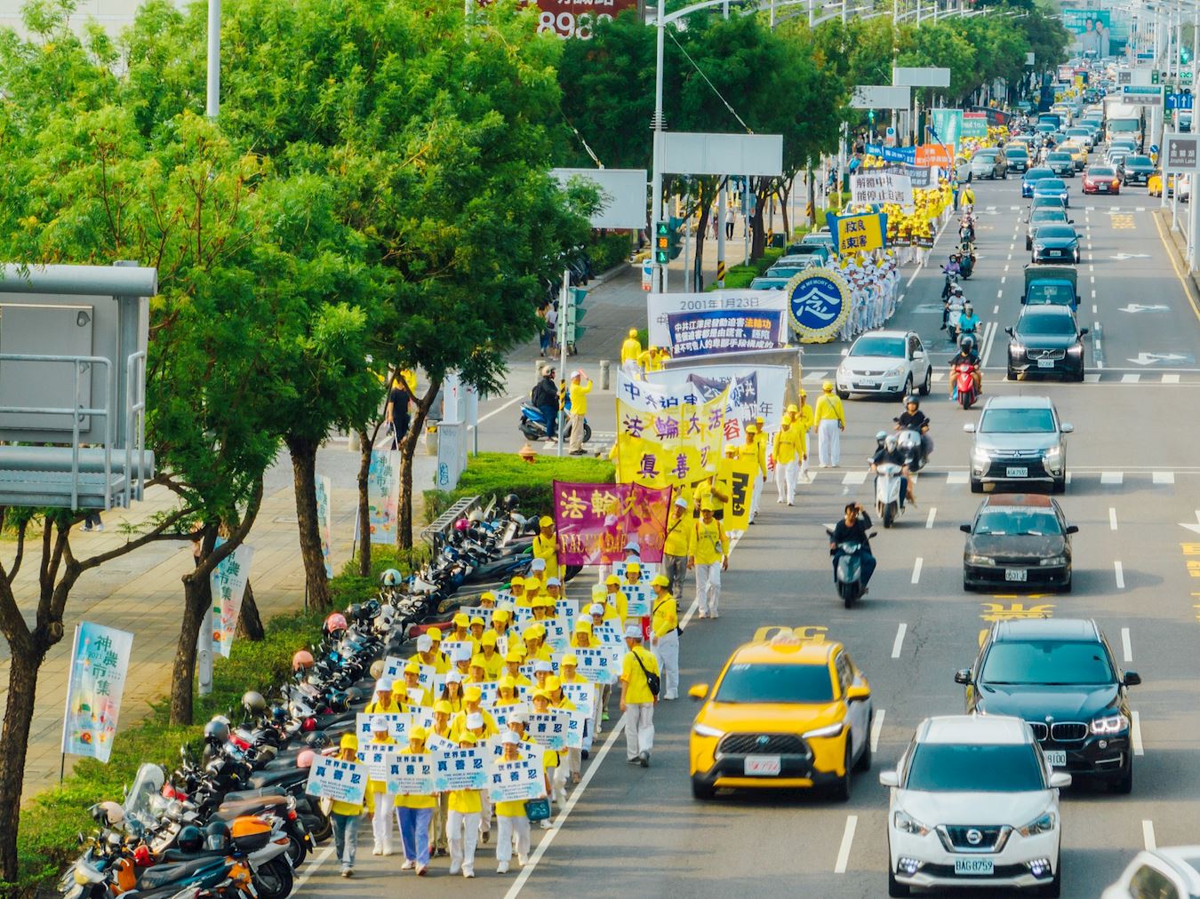 下午三点左右,由天国乐团领队的游行队伍,分成“大法洪传”、“千古奇冤”、“三:退.大潮”、“结束迫害”等四大方阵,从凹子底森林公园出发,经过鼓山附近的繁华街区,南台湾跨党派政要,也走入法轮功学员游行队伍同行。游行队伍和集会吸引了各界人士的关注,许多民众双手比赞表示支持法轮功。