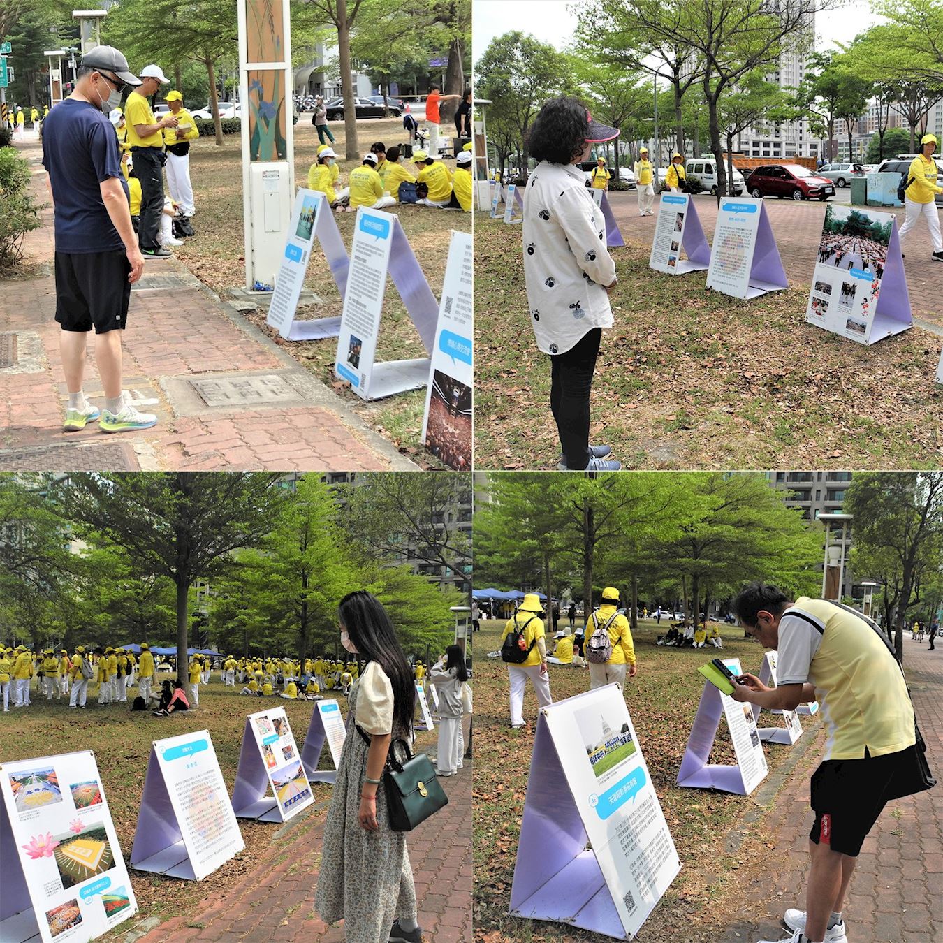 高雄凹子底森林公园集会地点,上午开始就在会场两侧摆起法轮大法真相图片,也有法轮功学员在现场教民众学炼法轮功的五套功法。