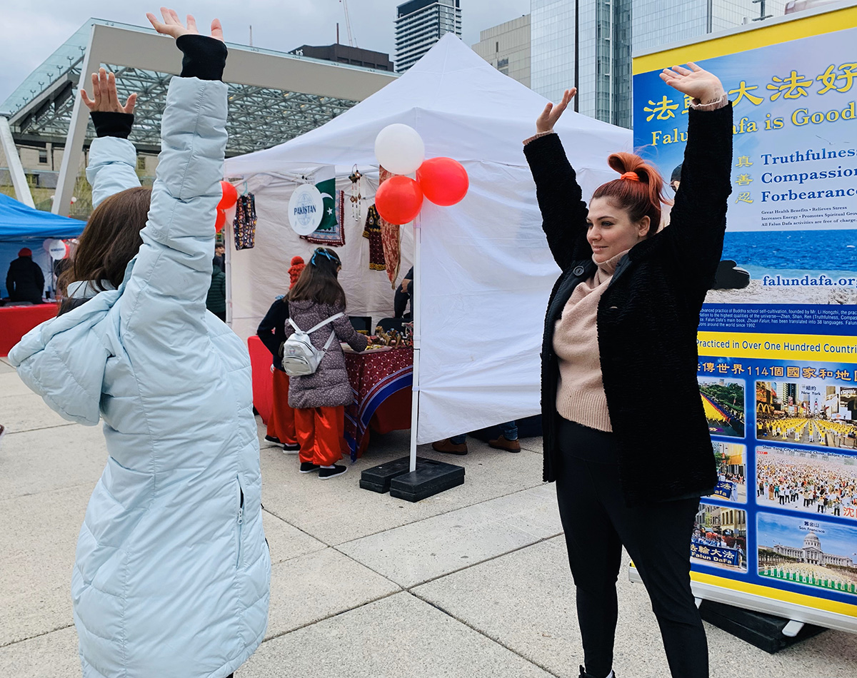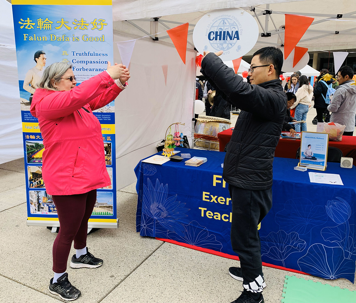 艾莉森(Alison)来到展位前,对功法感到好奇,不停地向学员提问,还让学员教她炼功。炼完第一套功法以后,她说,“拉伸的动作舒展了我的身体,我感觉很好。”