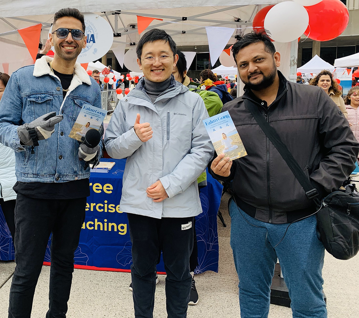 罗宾(Robin)和萨加尔(Sagar)是约克大学的学生。他们是社交媒体的视频博主,有三万粉丝。他们来到展位前,问能不能直播学员炼功的画面,然后在他们的镜头前介绍法轮大法,学员欣然同意。