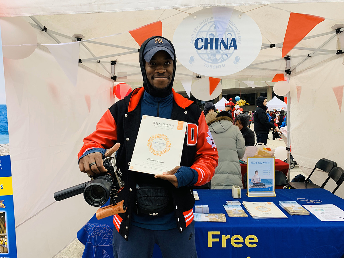 诺亚(Noah)是名摄影师,他的工作展位在法轮大法展位的对面。他拿起相机,对着正在炼功的学员拍摄。他告诉学员,“我每天都会打坐一小时,这个习惯让我变得平静和谦卑。”
