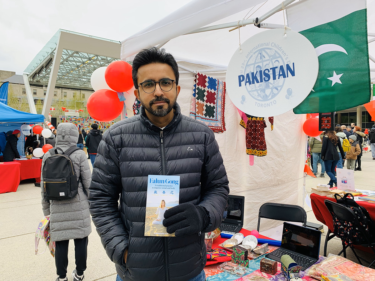 阿明(Amin)代表巴基斯坦社区来参加活动。他的展位在法轮大法展位的隔壁。他主动对学员说,你来我的展位这边,过来给我讲讲,我想要了解这个功法。”