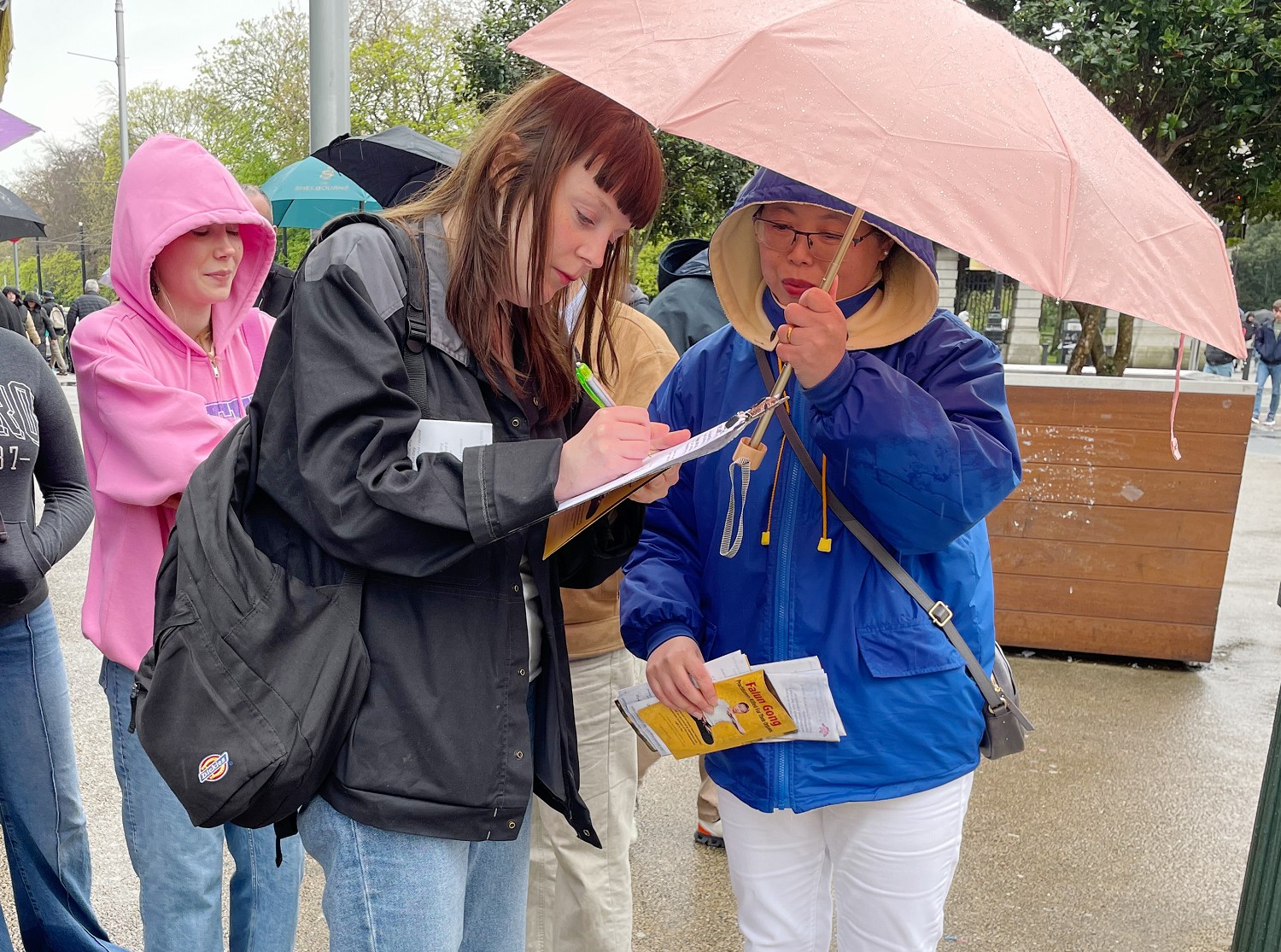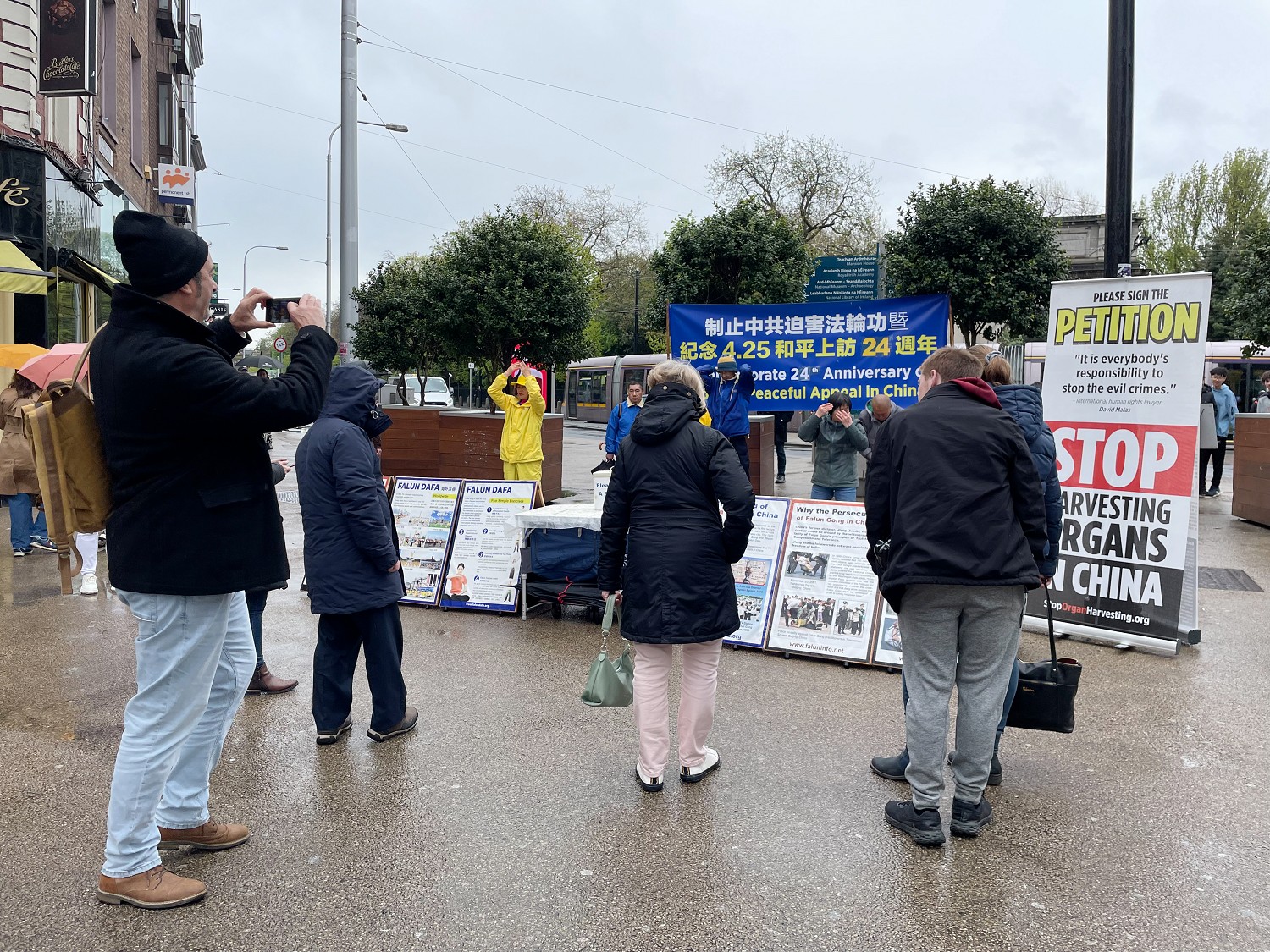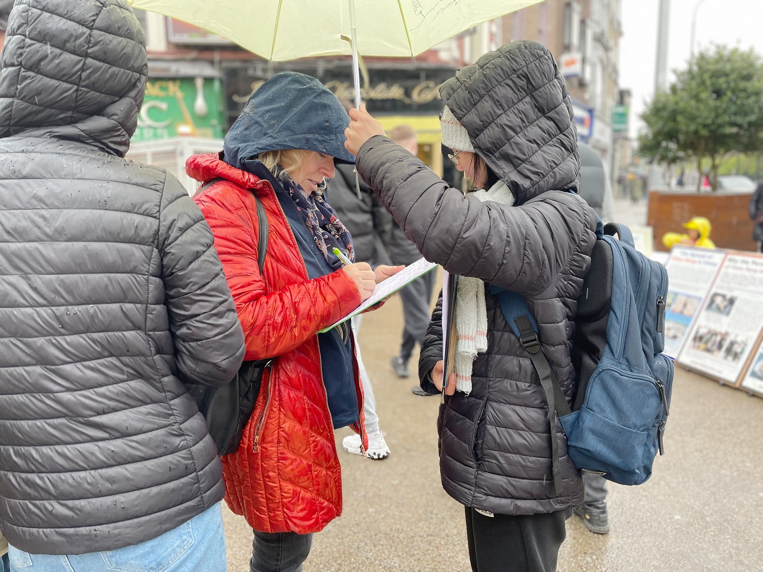 当日下午,天空阴雨绵绵。过往民众看到学员们无畏风雨、坚持传真相,深感敬佩,许多人拿出手机拍照,主动前来与学员交谈,并在了解真相后签名支持法轮功学员反迫害。也有人询问炼功点信息或留下联系方式,当场决定学炼法轮功。
