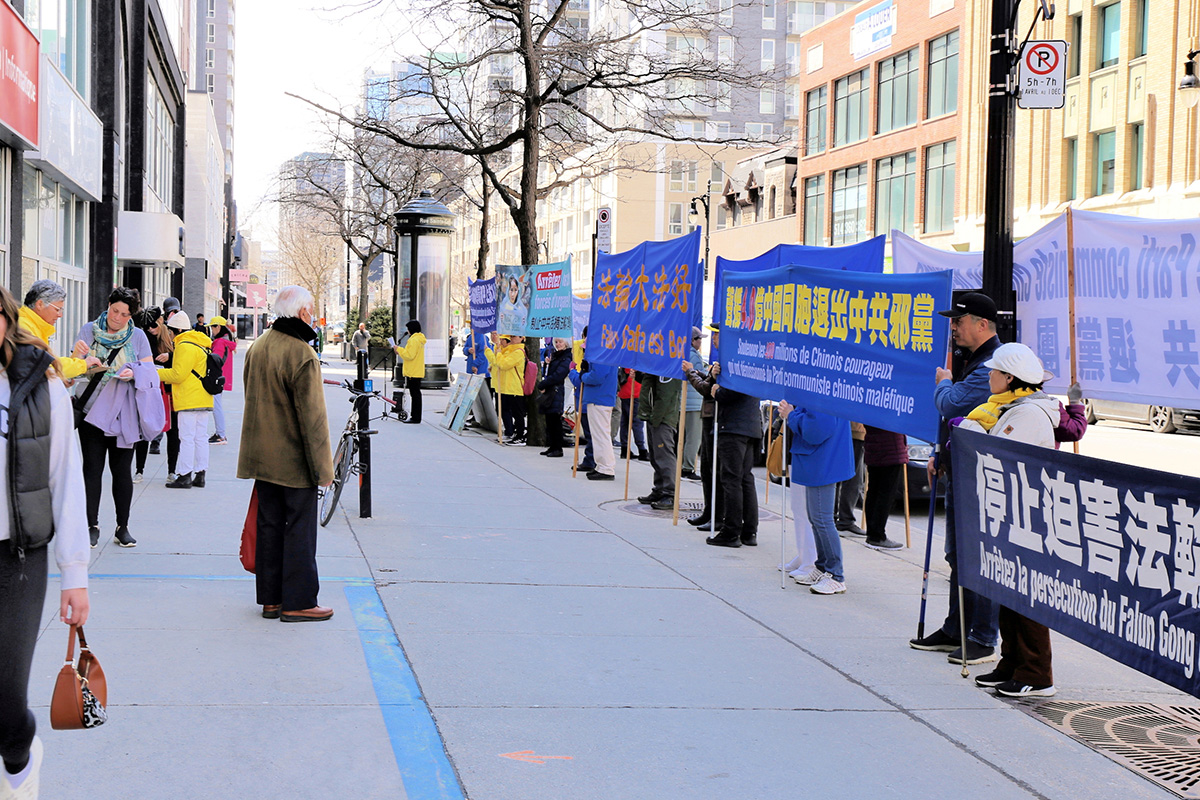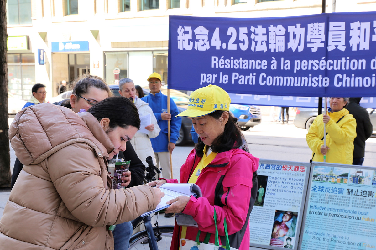 ![]() 图4~5:四月二十五日,蒙特利尔部份法轮功学员在中领馆前纪念4.25和平上访24周年,并要求中共停止迫害。图为民众在反迫害征签信上签名。 |