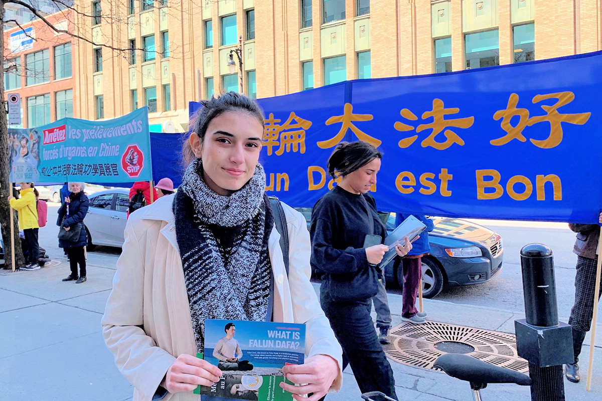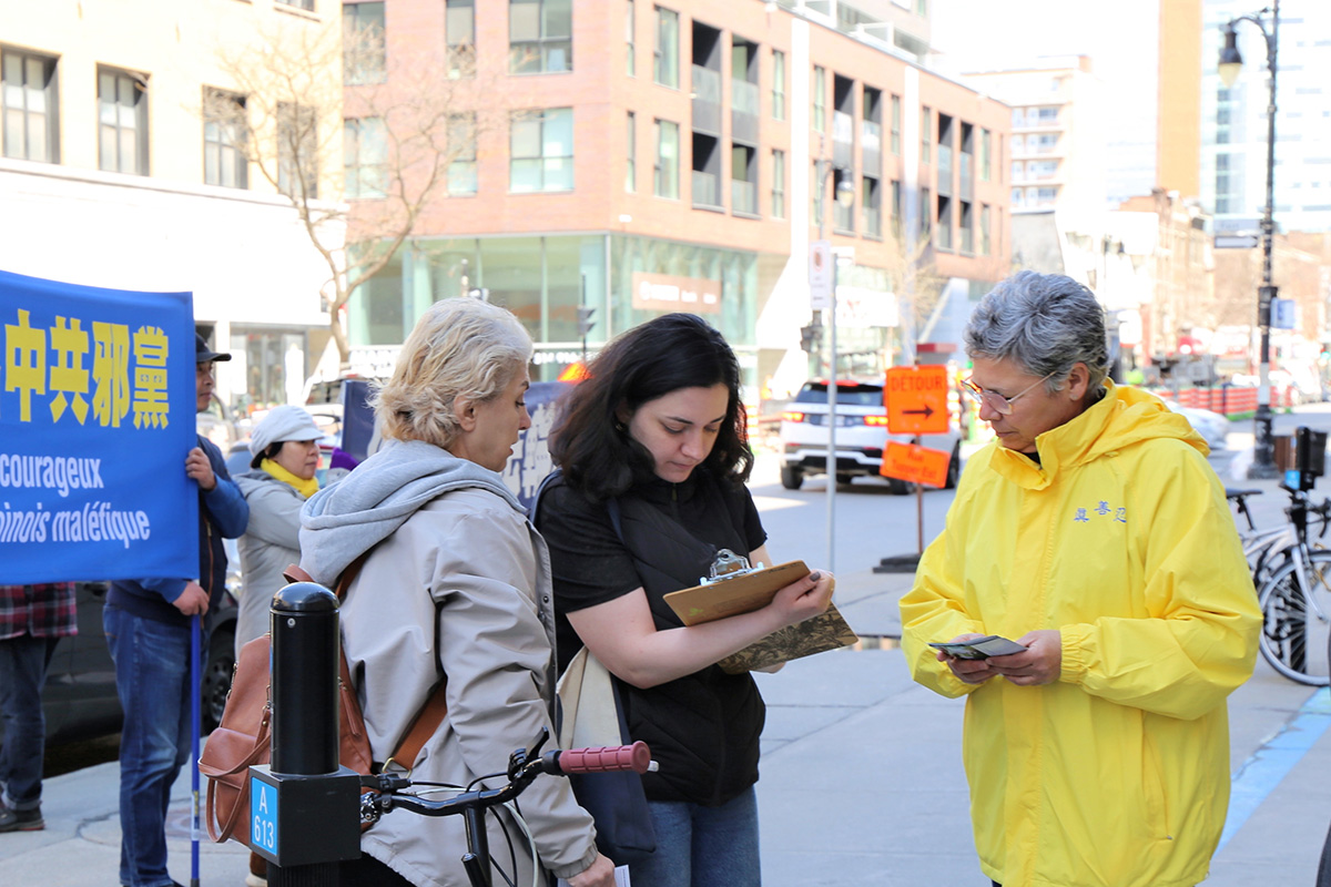 蒙特利尔一家剧院工作的艾米(Emy)在和法轮功学员交谈后,表达支持。“得知他们(在中国)没有信仰的自由,我非常悲伤。我们这里是幸运的。而让我高兴的是,他们在这里举行活动,让我们了解所发生的事情。”她继续说,“他们很平和,我希望继续,坚持不懈很重要。”
