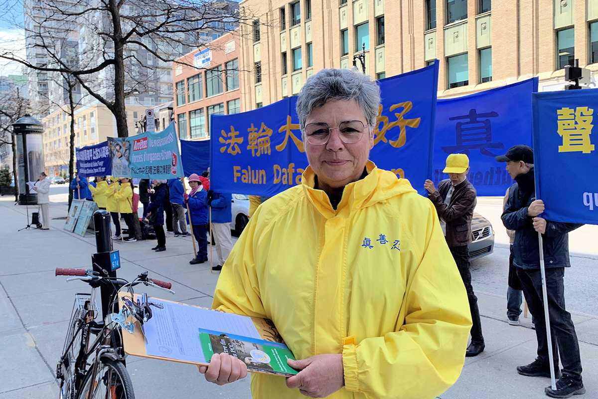 托姆(Thome)女士在卑诗省政府工作过三十四年,刚刚退休搬来蒙特利尔,这是她第一次看见法轮功学员的活动。