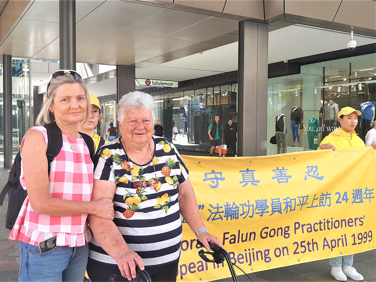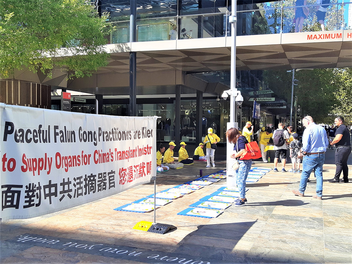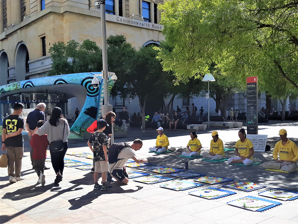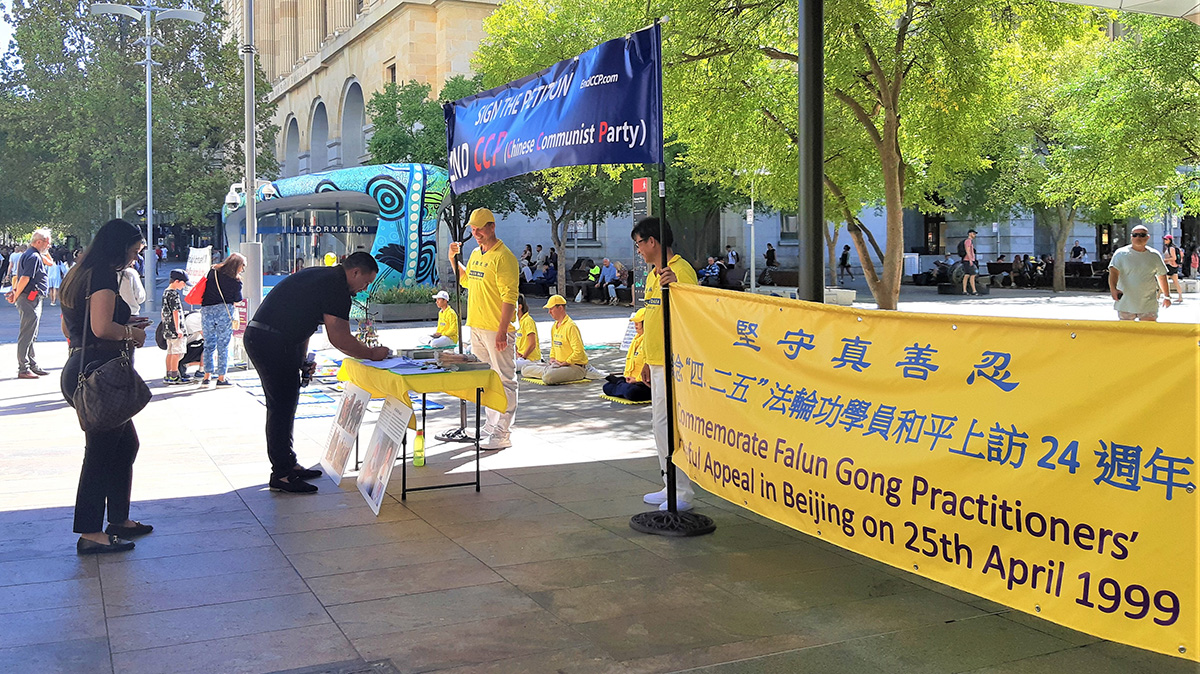 四月二十二日周六,法轮功学员在西澳柏斯市中心默里街购物中心步行街(Murray Street Mall)展示真相横幅与展板,举行反中共迫害征签活动,介绍当年中国大陆法轮功学员的和平抗争为世人带来的勇气与希望。民众感佩法轮功学员始终如一的坚忍和善良。听闻迫害事实,不少人当场落泪。有的说:“你们的抗议安静平和,让人动容”,“每个人都应该修炼真、善、忍”;有的说:“你们的呼吁可能是改变的开始”;还有的说:“人们都需要了解真相。”