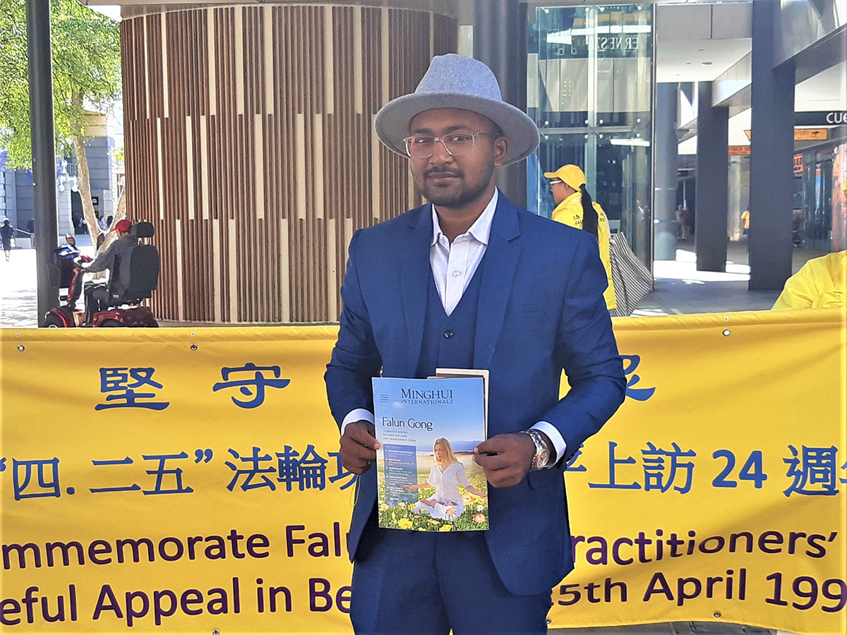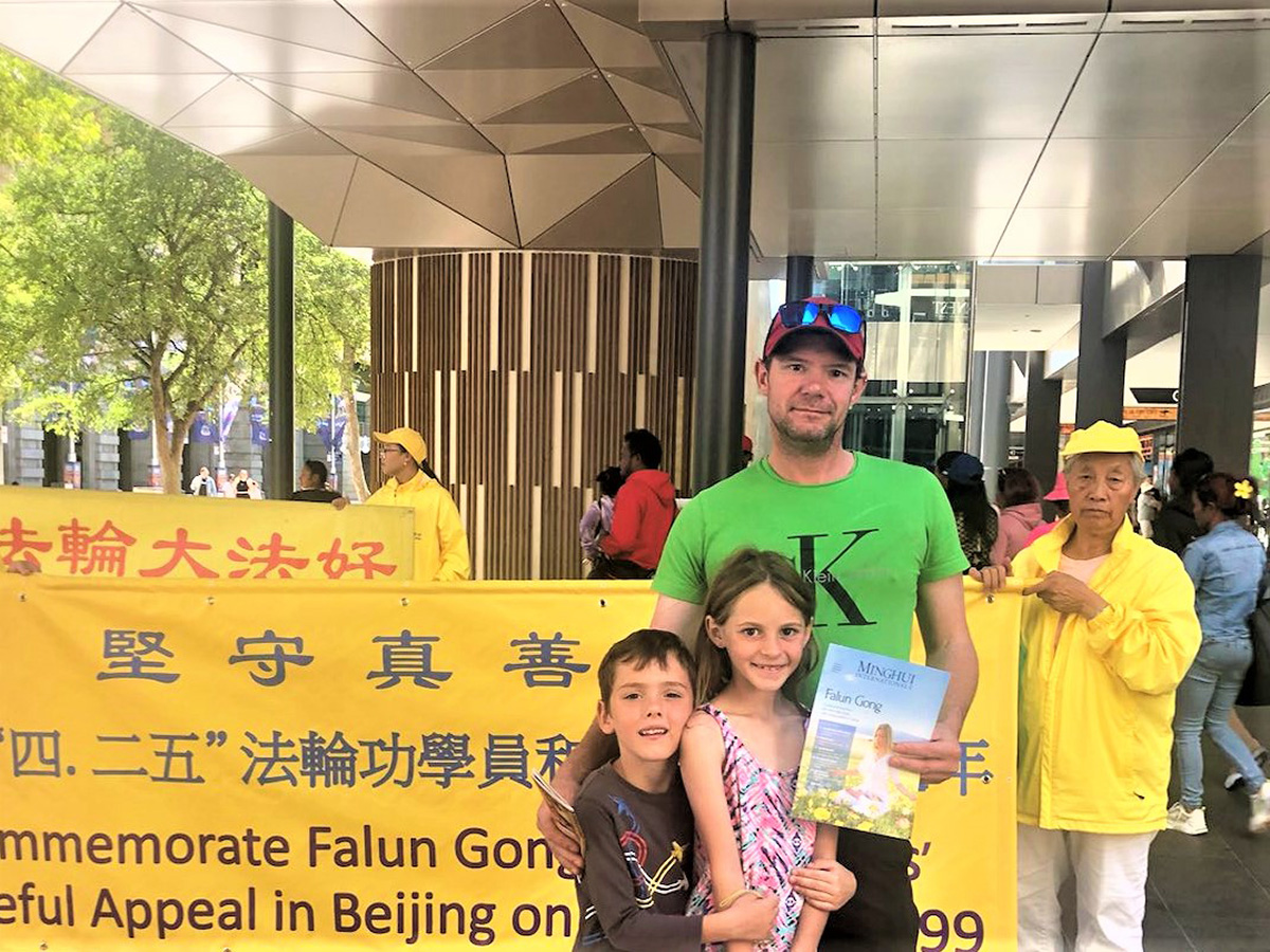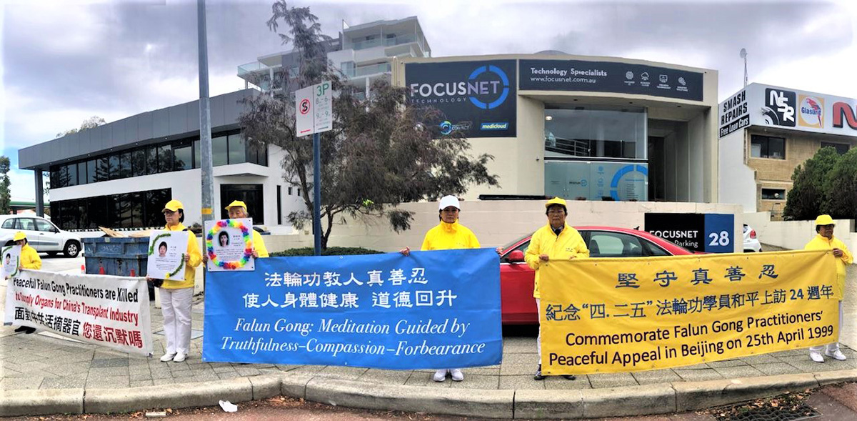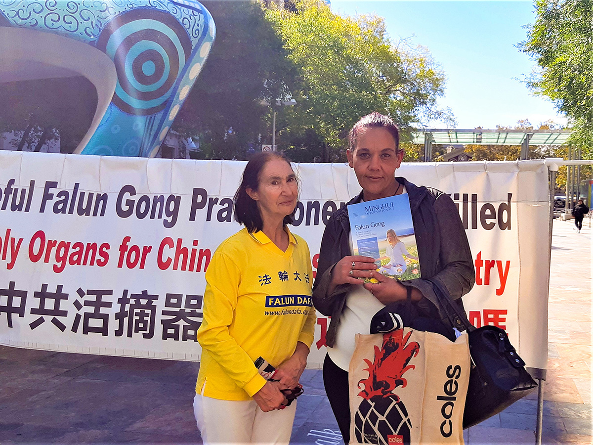 四月二十二日周六,法轮功学员在西澳柏斯市中心默里街购物中心步行街(Murray Street Mall)展示真相横幅与展板,举行反中共迫害征签活动,介绍当年中国大陆法轮功学员的和平抗争为世人带来的勇气与希望。民众感佩法轮功学员始终如一的坚忍和善良。听闻迫害事实,不少人当场落泪。有的说:“你们的抗议安静平和,让人动容”,“每个人都应该修炼真、善、忍”;有的说:“你们的呼吁可能是改变的开始”;还有的说:“人们都需要了解真相。”
