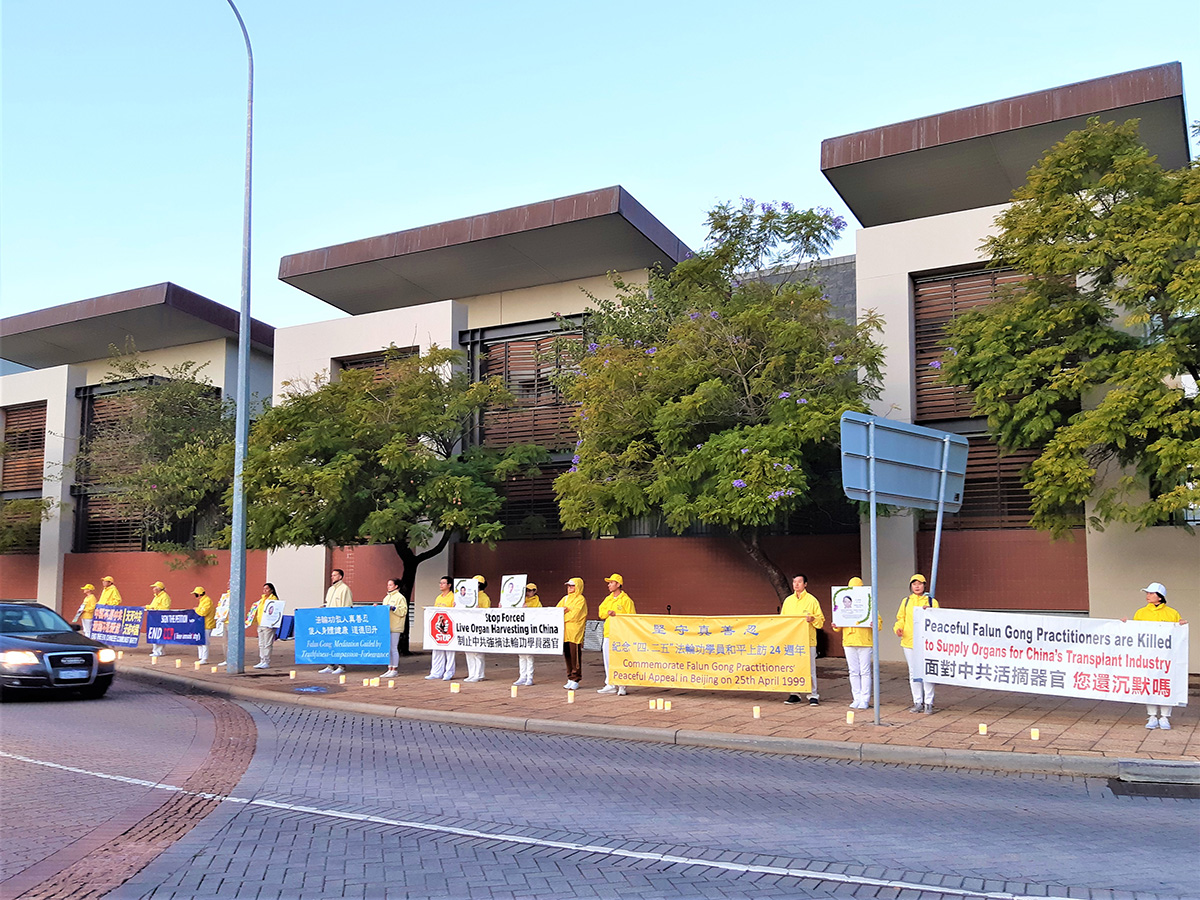 四月二十四日当天傍晚,法轮功学员在中领馆旁的步行道上,点亮白色蜡烛,举行烛光守夜活动,纪念被中共迫害致死的中国大陆法轮功学员,并展示受害者花环遗照和“中国不是中共 爱国不是爱党”等横幅。马路上开车经过的很多民众向法轮功学员挥手致意。