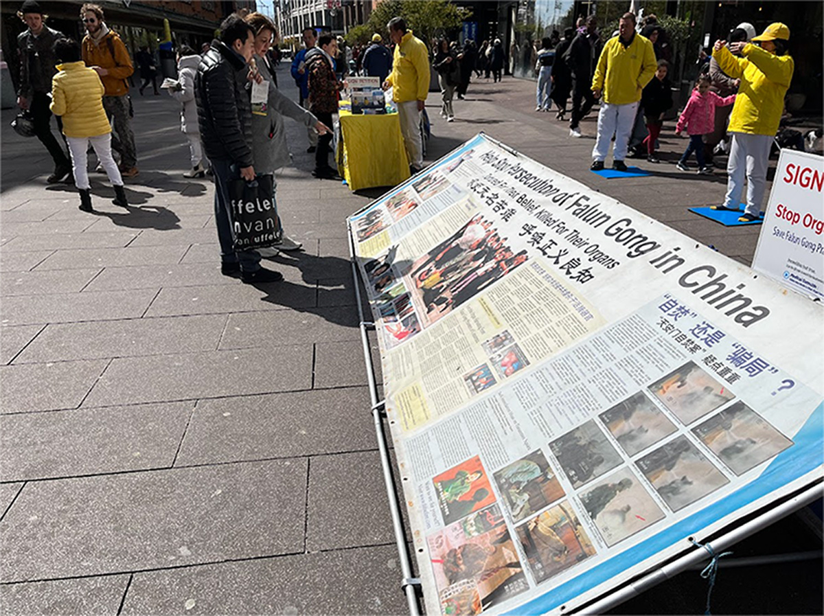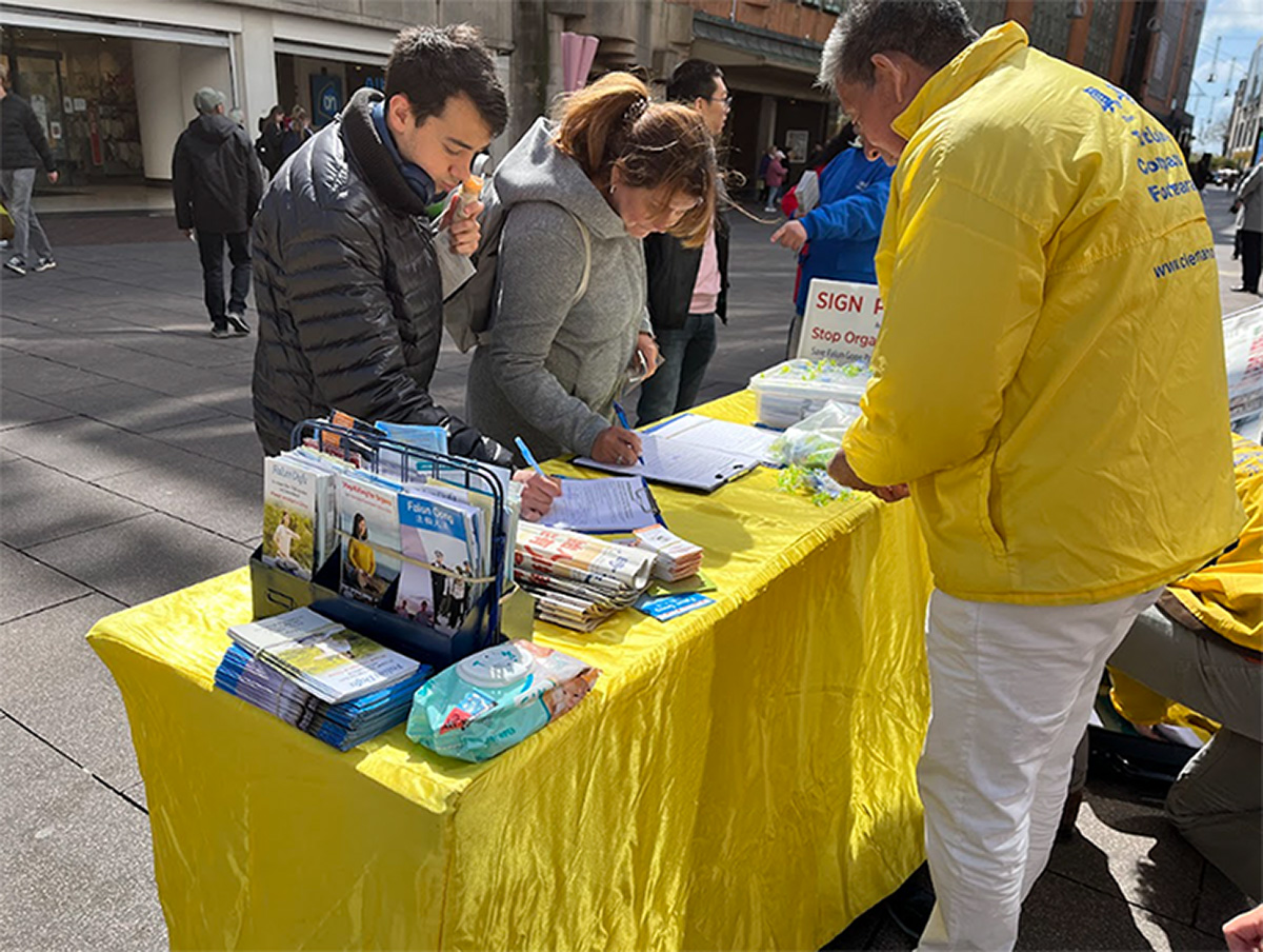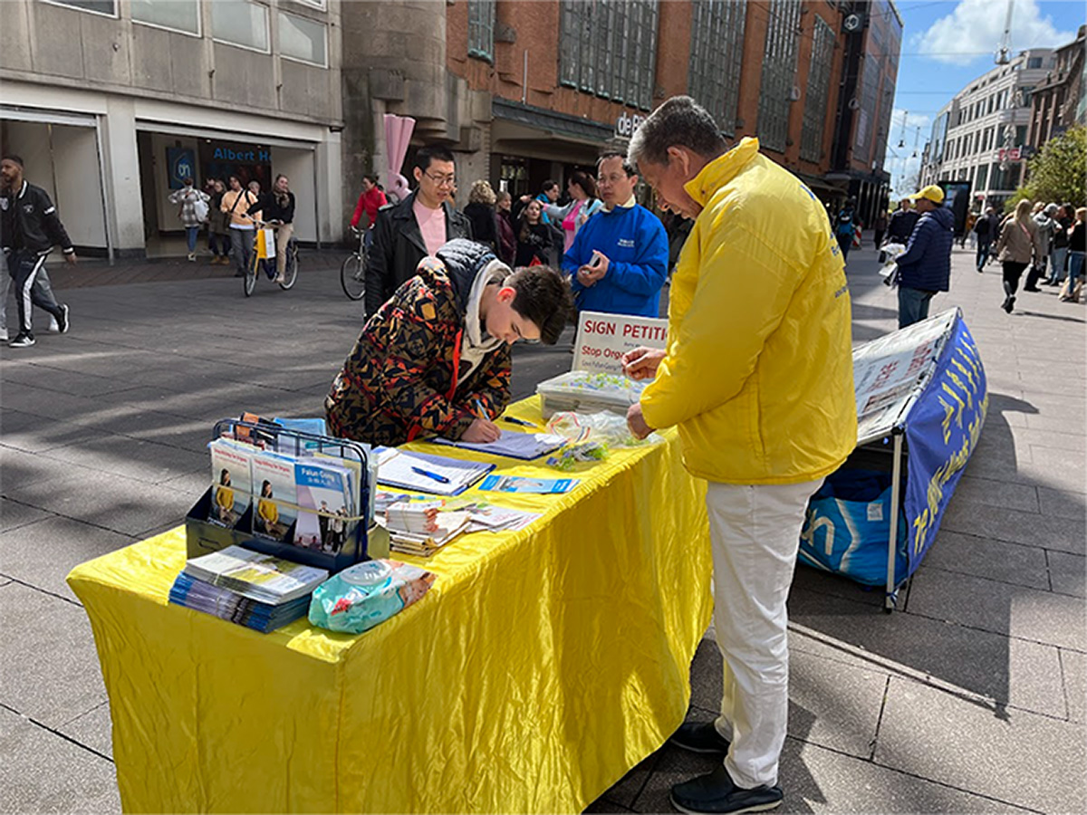 下午,法轮功学员在海牙市中心举办活动,唤起人们对这场迫害的关注。学员们向过往行人征签,呼吁停止在中国的迫害及活摘法轮功学员器官。这在繁华的市中心引起许多海牙居民的关注,他们驻足阅读横幅上的文字,并在法轮功学员致荷兰政府的请愿书上签名,谴责在中国对法轮大法的迫害,以及中共活摘法轮功学员器官。