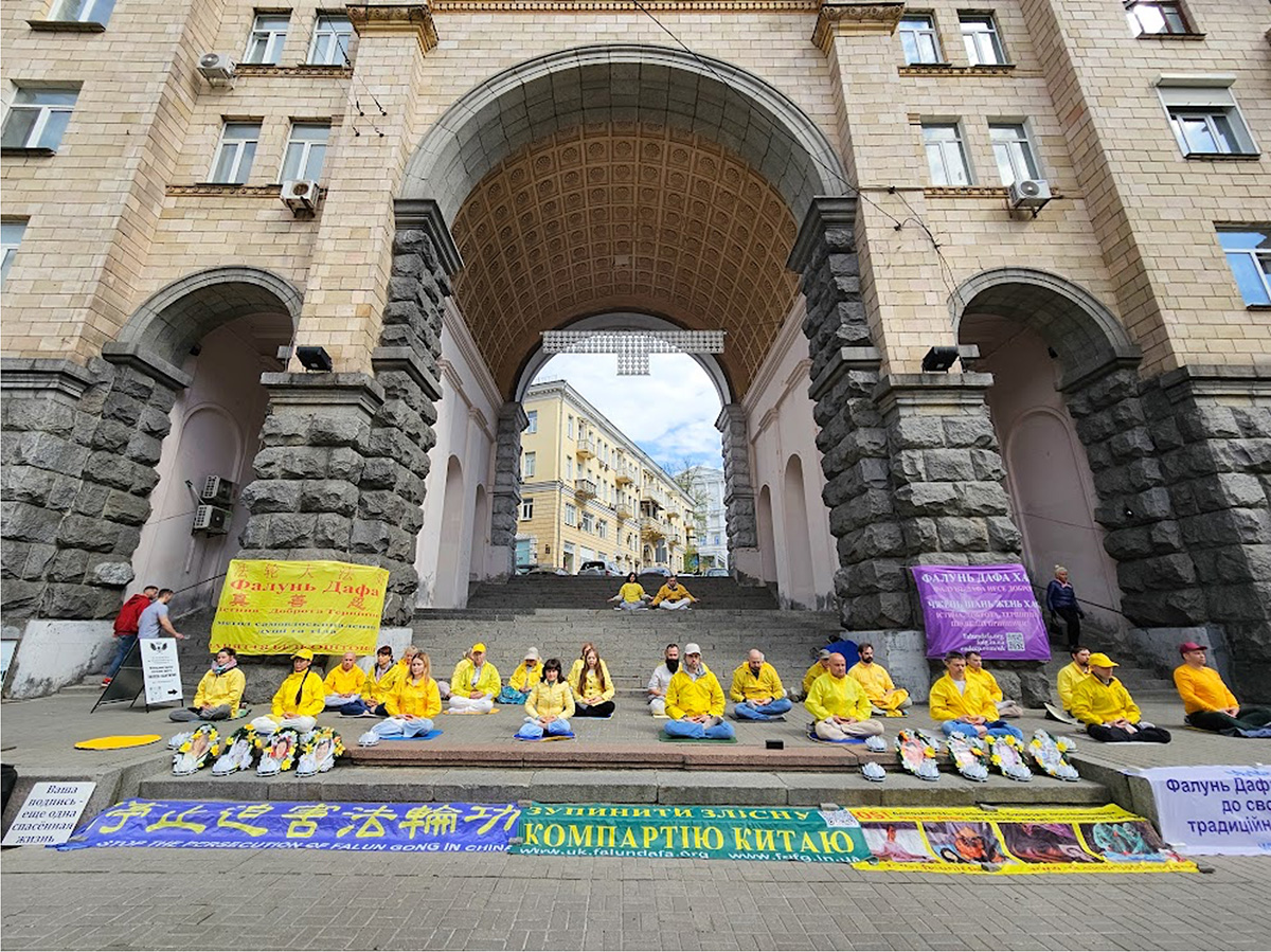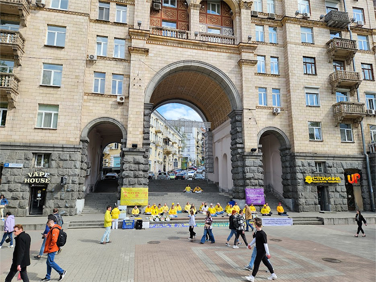 ![]() 图1:二零二三年四月二十三日,基辅法轮大法学员在乌克兰首都的主要街道克列夏季克大街,纪念“四·二五”和平上访二十四周年。 |