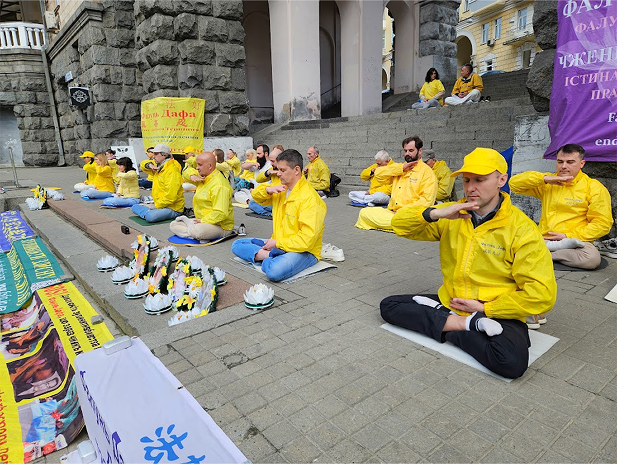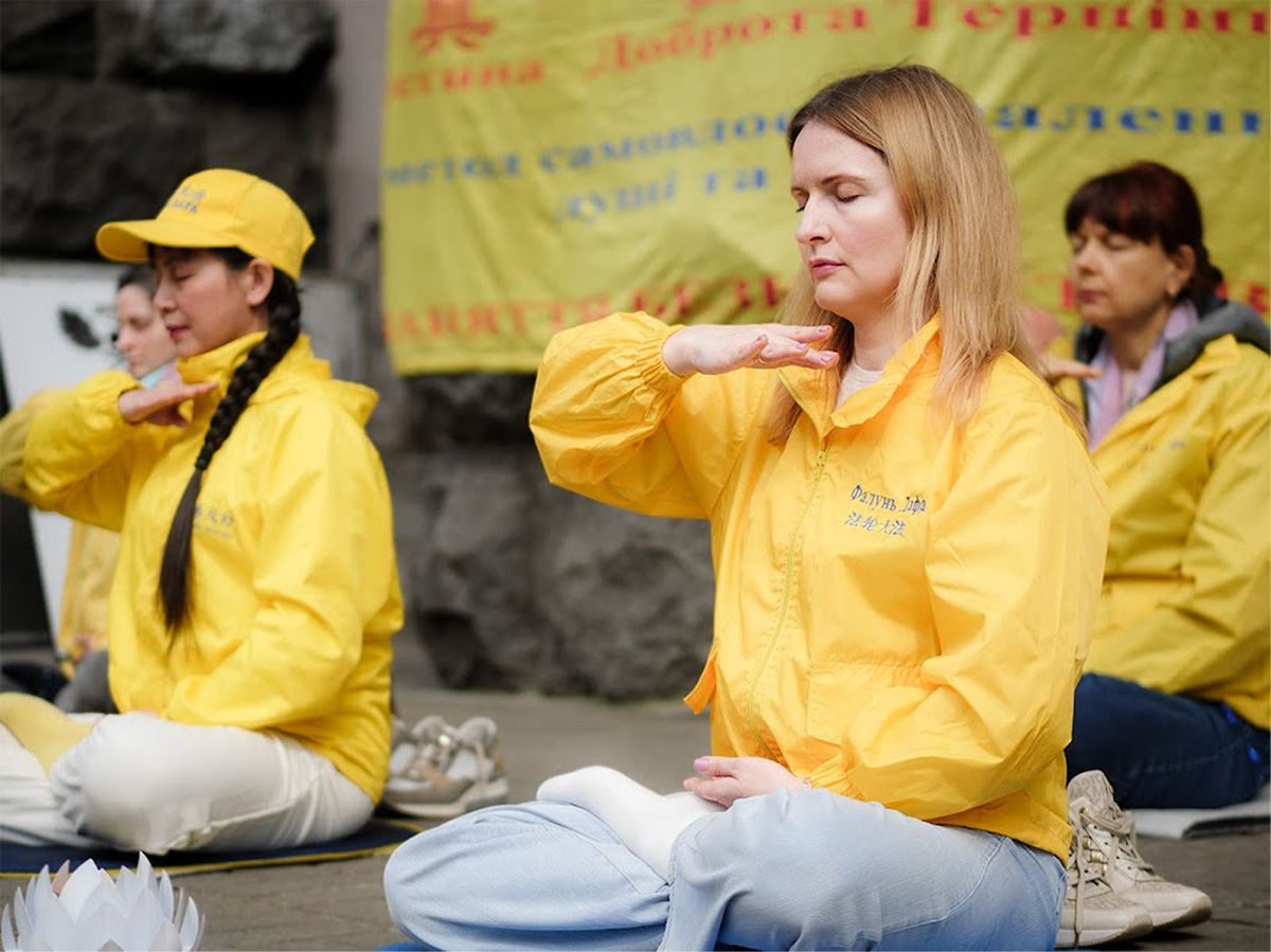 在纪念活动中,乌克兰法轮功学员连续三个小时炼功、发传单。他们还征签,过往民众在谴责中共酷刑迫害法轮功学员的请愿书上签名。