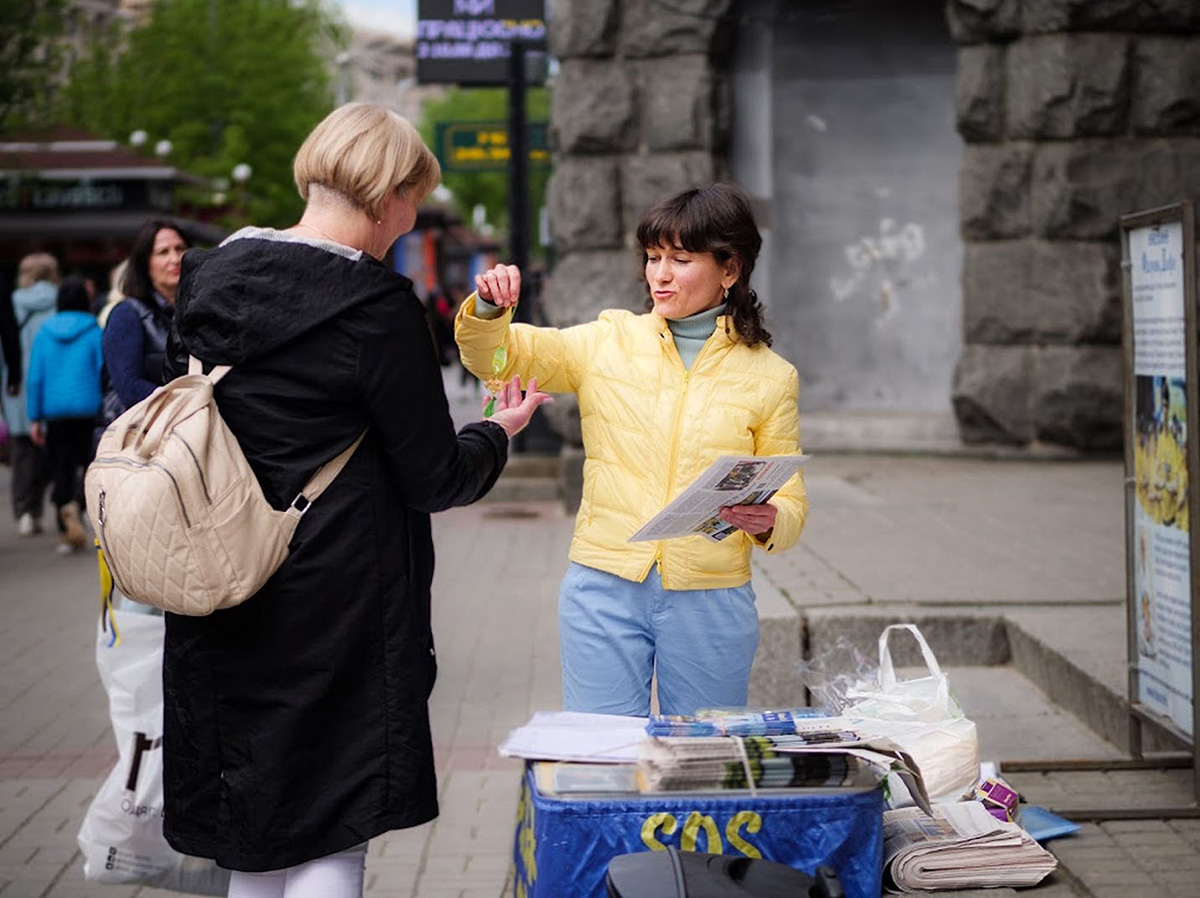 一位年轻女士也找到学员,她最近在基辅一家书店购买了法轮大法主要著作《转法轮》。她说,真是太神奇了,她以前对法轮功和这本书一无所知,无意中买了书后,马上在克列夏季克大街上就遇到了法轮大法学员,这样就能进一步了解法轮功并学炼功法。
