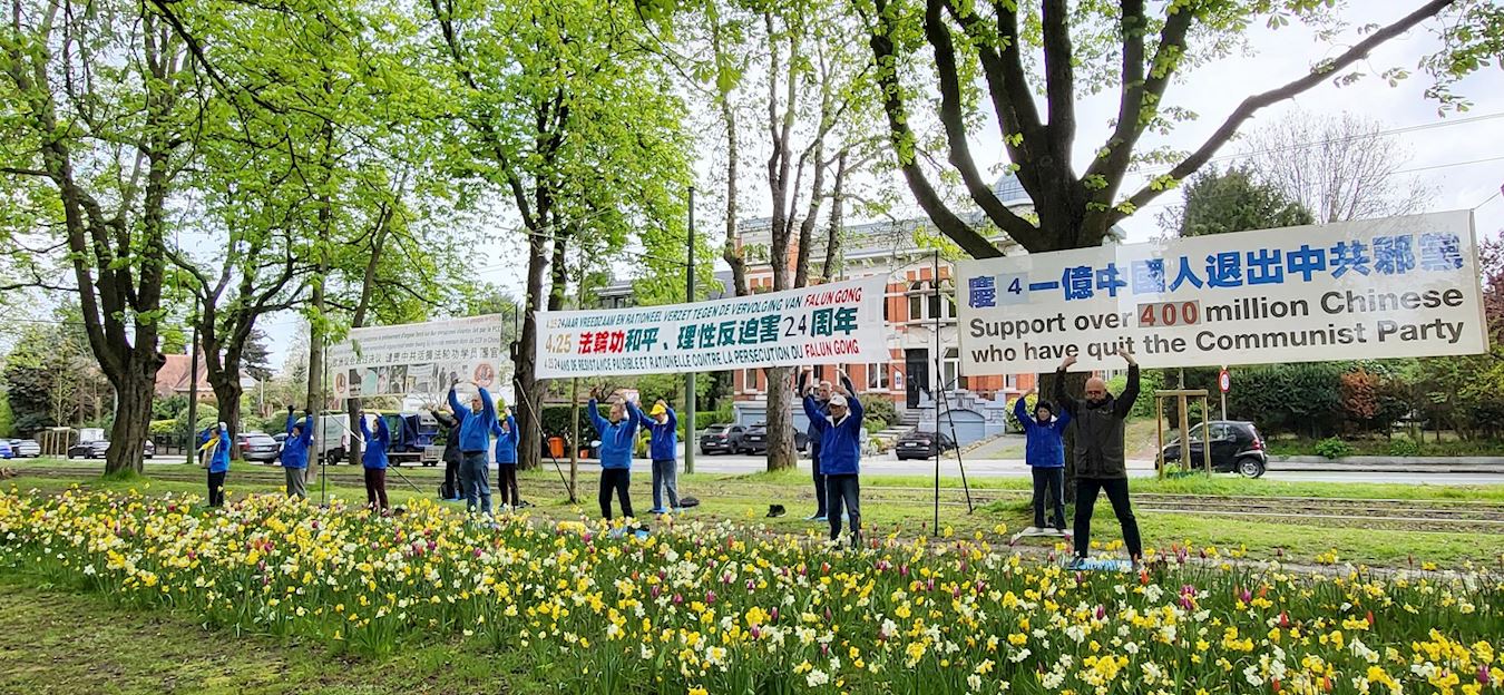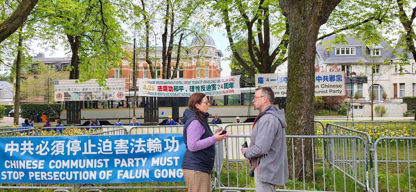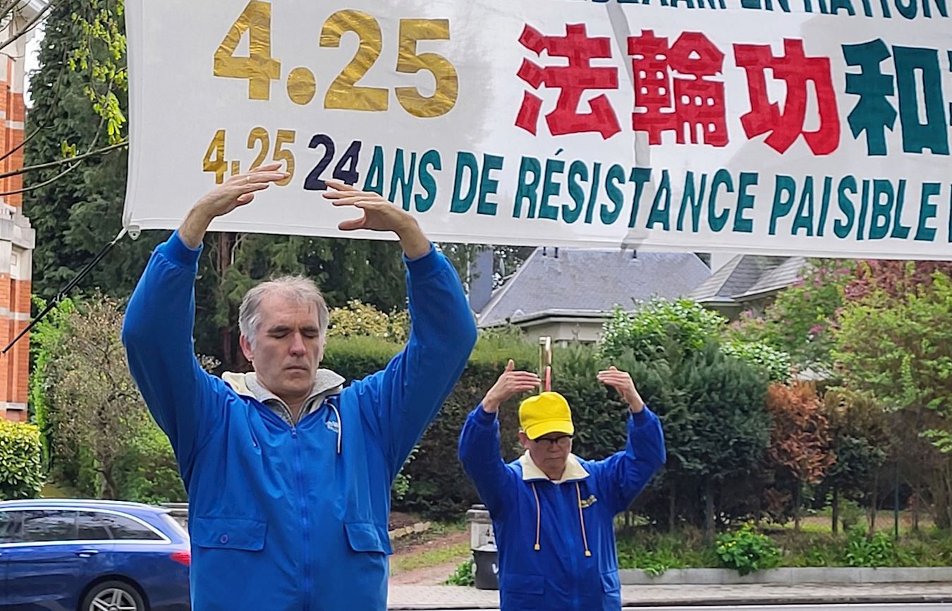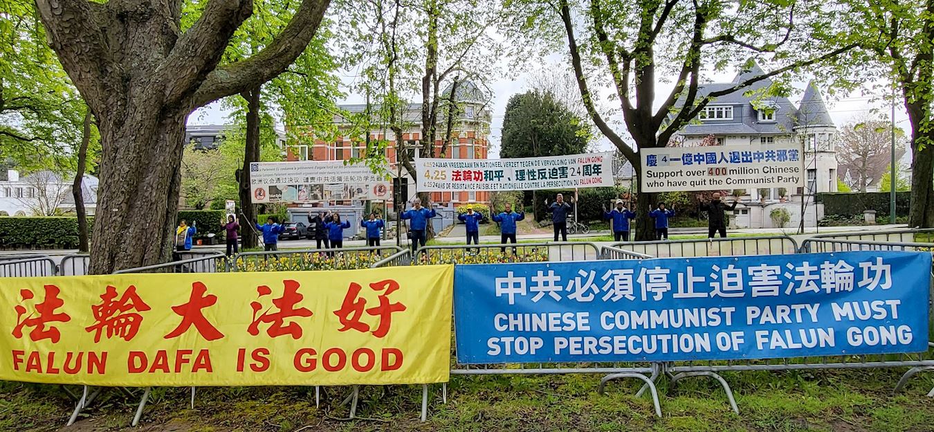 ![]() 图1~2:中使馆前比利时法轮功学员纪念四·二五,展现法轮大法的美好,反迫害。 |
