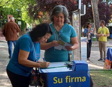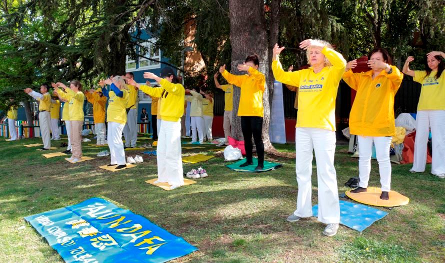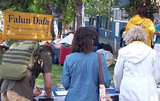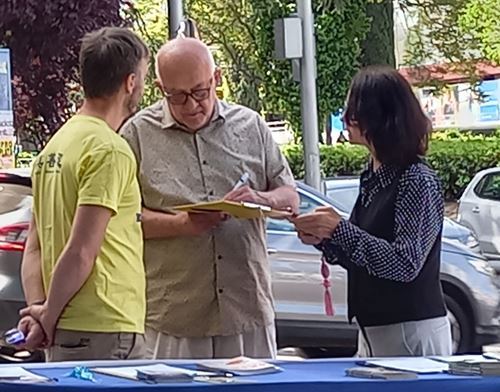 一面面醒目的横幅立刻吸引住过往行人的目光,人们停下匆匆的脚步观看反迫害图片和传单,在了解中共对信仰真、善、忍的法轮功修炼者的残酷打压,及活摘法轮功学员人体器官牟利的罪行真相后,纷纷签字谴责中共暴行,声援法轮功学员反迫害。