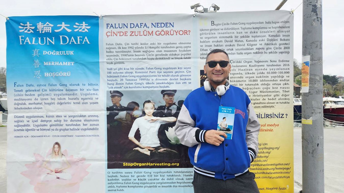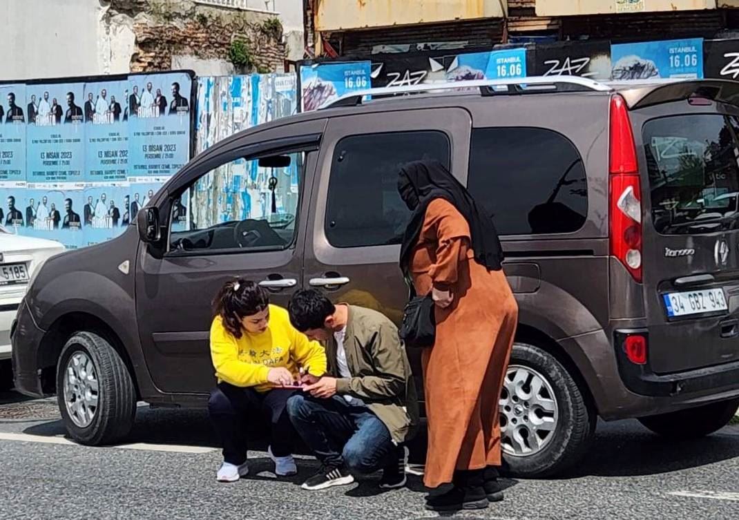 一辆汽车停在了学员的活动区前。车内人说:“当我看到‘停止在中国的迫害’的文字时,我就想停下来。我能做什么呢?”他告诉学员,他和家人也是维吾尔族土耳其人,了解了法轮功被迫害的真相后, 他们也在停止迫害的请愿书上签了名。