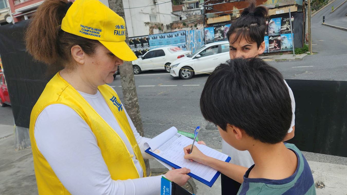 两名十多岁的青少年告诉学员,他们想了解抗议活动,并郑重地在停止迫害和结束中共的请愿书上签名。离开前,他们为自己的家人拿了资料。