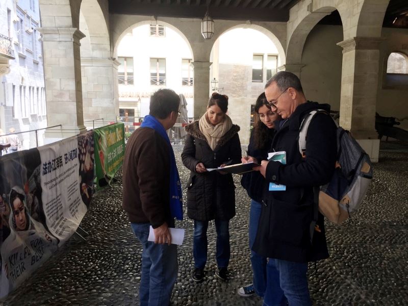活动当天,学员们展示了祥和的法轮功功法,一些州、市议员到场表示支持。日内瓦市议员达尼埃尔·达尼·帕斯托赫(Daniel-Dany Pastore)不但签名支持法轮功学员反对中共的残酷迫害,他还说:“幸好有一些像你们这样的人在世界上起着作用,因此能够在各个领域改善人类的生活条件。幸好有你们存在,因为世界上有些恶劣无耻的行为在发生,该是所有人做出反应的时候了!国际化的日内瓦摆正了自己的位置,(给其他国家)提供了一个很好的榜样。谢谢你们!”