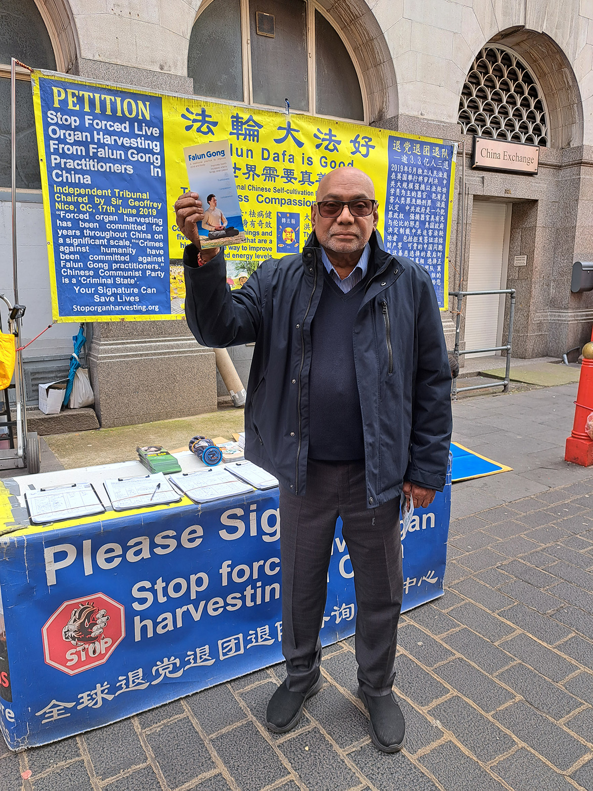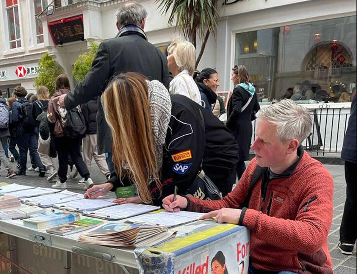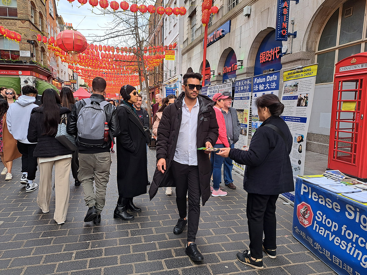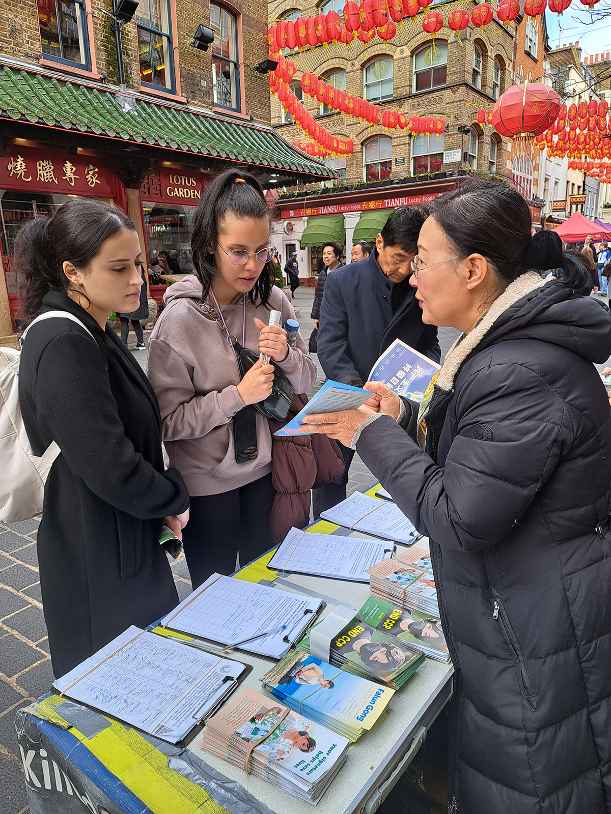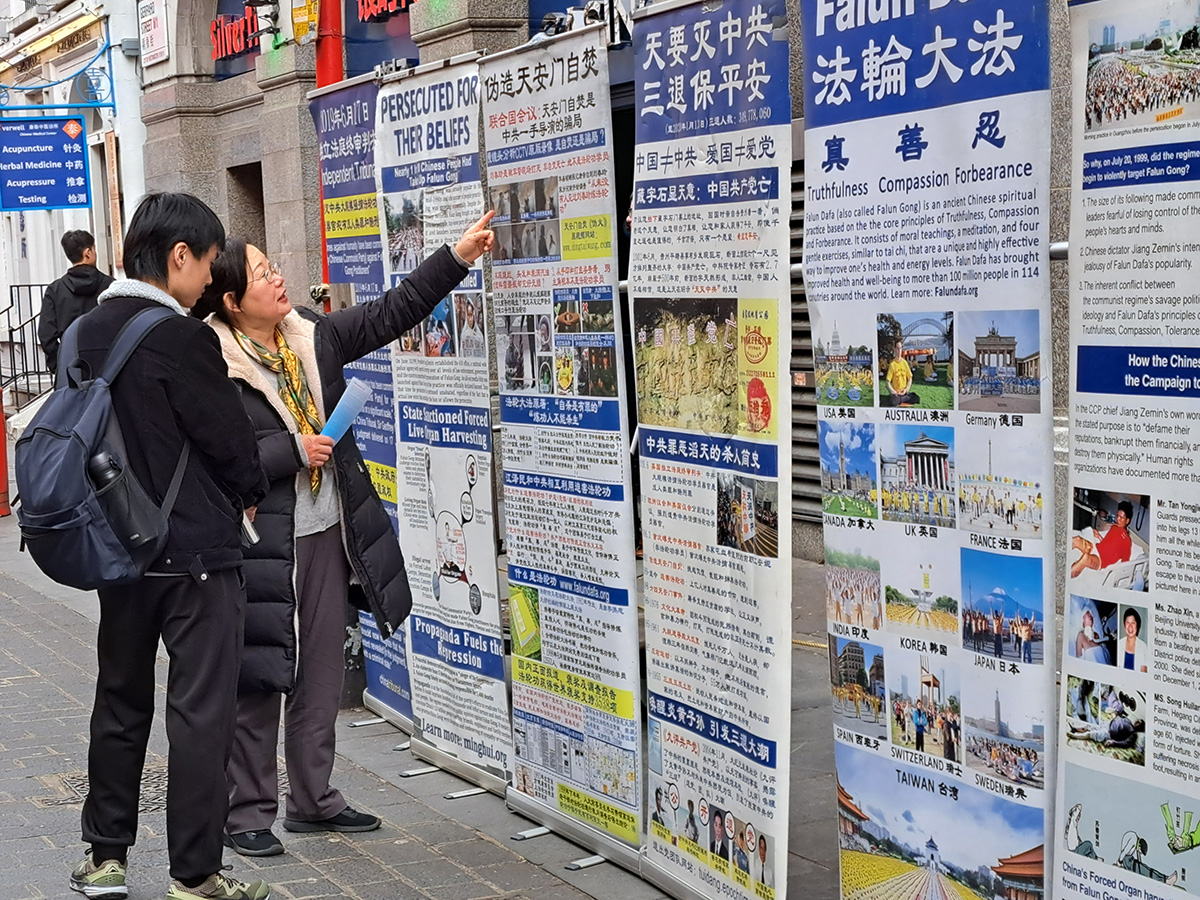 神韵在英国伦敦巡演期间,有民众看完演出后,转而在唐人街看见演出中见到过的法轮功横幅,惊喜中签名支持学员反迫害。