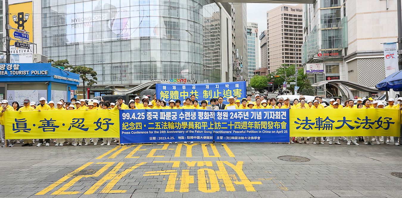 ![]() 图1:二零二三年四月二十五日,首尔地区部分法轮功学员聚集在首尔明洞中国大使馆附近,举行纪念四·二五和平请愿二十四周年的记者会。 |
