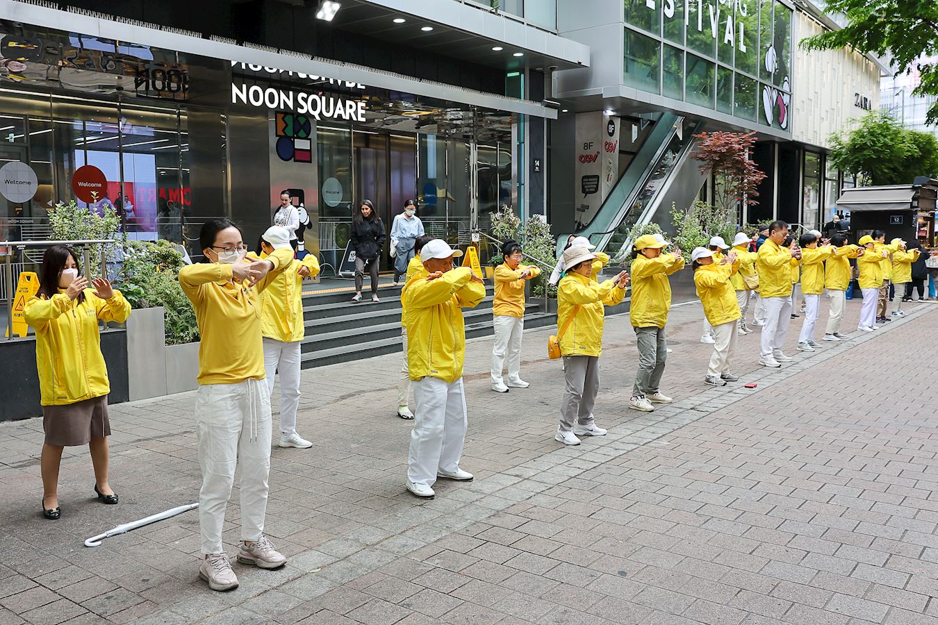 当天,清晨下起小雨,来自首尔地区法轮功学员在雨中,聚集在驻韩中国大使馆所在地——首尔市中心街道明洞入口处。正式记者会在中午开始,身穿印有“法轮大法好”文字黄色服装的学员们,在街道旁边井然有序地排着队,悠扬的炼功音乐一响,学员们在祥和的能量场中,开始集体炼功。