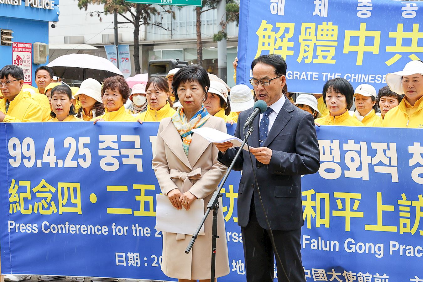 ![]() 图3:四月二十五日,在首尔明洞中国大使馆前举行的四·二五和平请愿二十四周年的记者会上,韩国法轮大法佛学会秘书长吴世烈宣读声明。 |